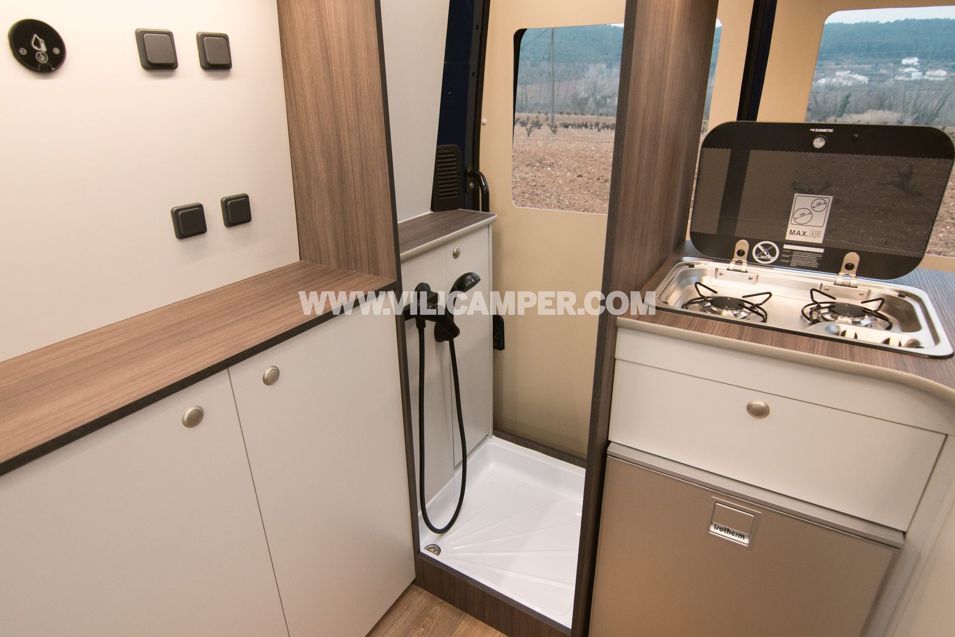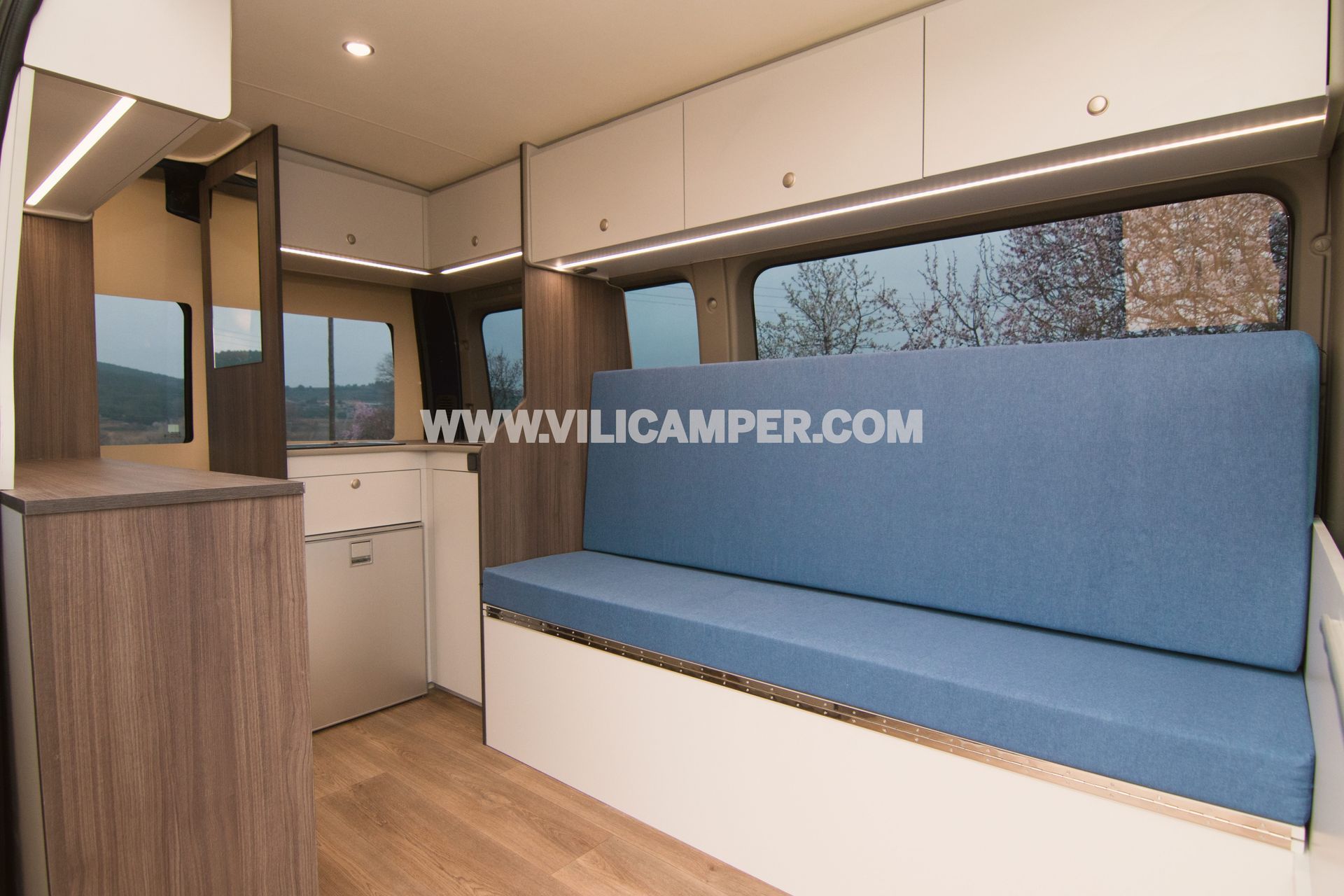 L´equipació completa inclou la instal·lació d´una segona bateria al vehicle per alimentar els dispositius elèctrics de la casa rodant i disposar d´il·luminació interior de baix consum energètic, juntament amb una centraleta per controlar el nivell de càrrega de bateries, nivell de dipòsits d´aigües i bomba. A més, té una cuina totalment equipada, amb fogons, aigüera i nevera.