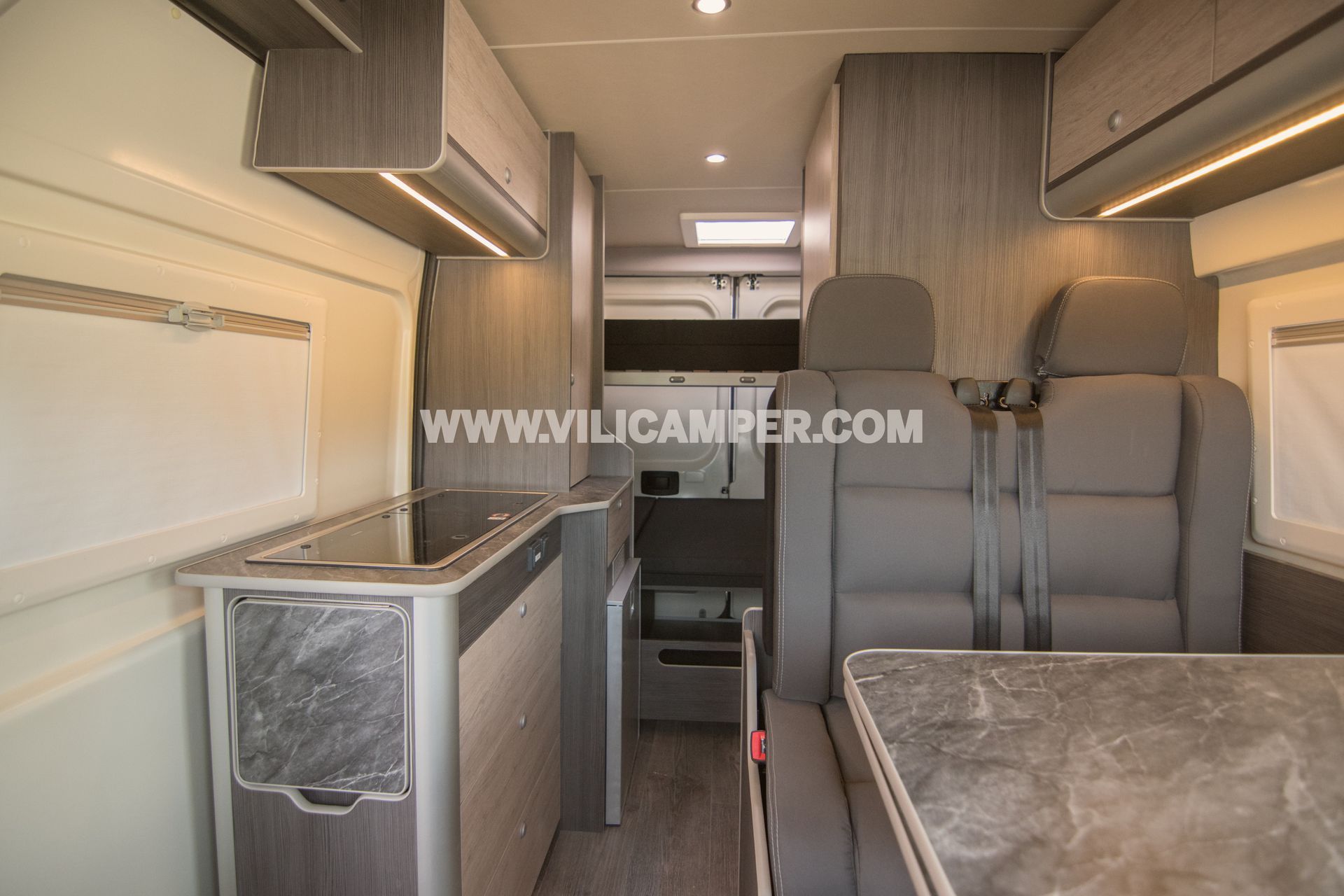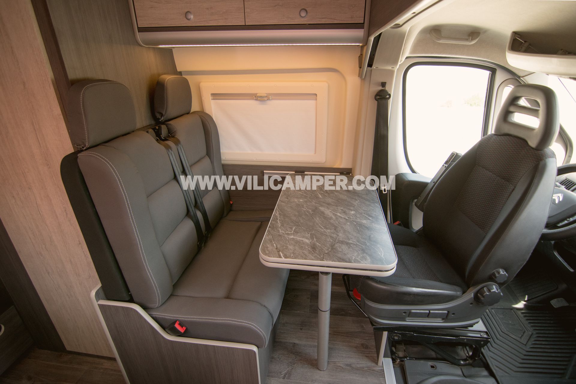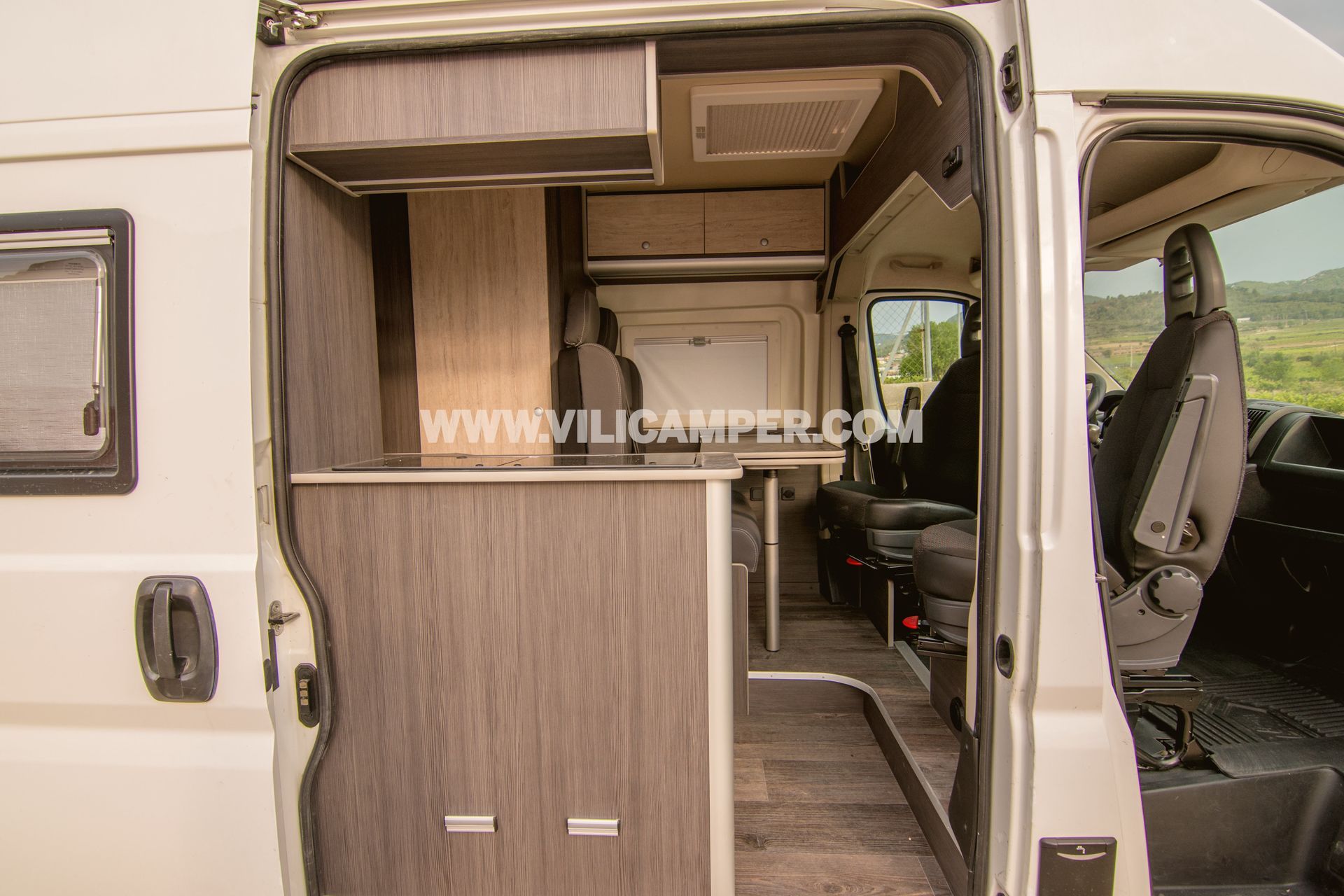 L'interior d'aquesta camperització ha estat adaptat per oferir una distribució versàtil i optimitzada. En entrar, trobaràs una acollidora àrea d'estar amb seients giratoris que es transformen en una còmoda zona de menjador per compartir àpats deliciosos en companyia. A més, comptem amb àmplies finestres i claraboies que proporcionen una il·luminació natural excepcional i permeten gaudir de les vistes panoràmiques de l'entorn.