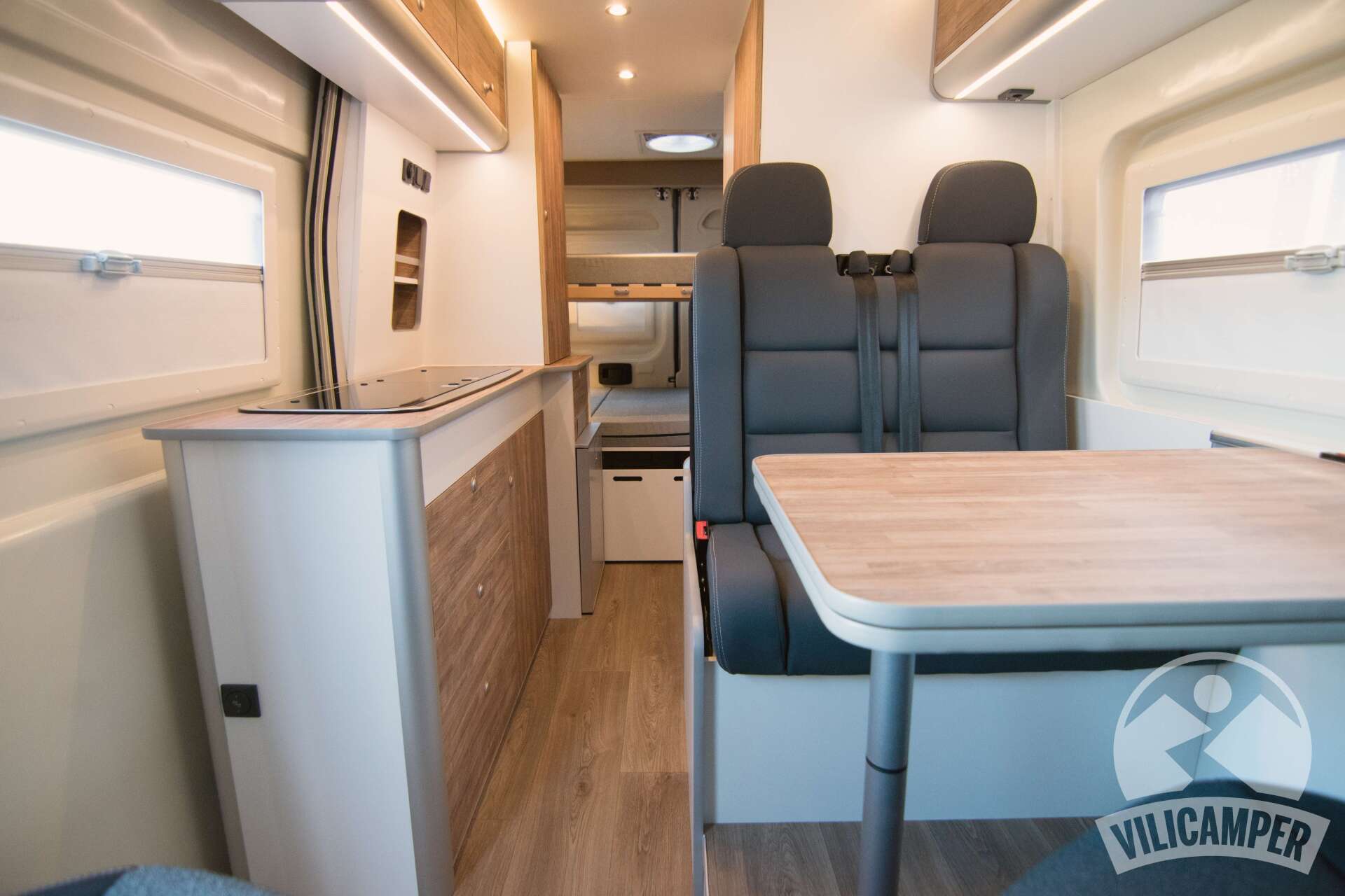Fusta de contraxapat HPL i cantejat en PVC i cantell de goma2 arcons posteriors sota el llitDormitori amb llitera superior desmuntableArmari inferior de cuina amb 3 calaixos i 1 porta sota l'aigüera amb prestatgesArmari lateral guarda-roba 1 Calaix gran damunt la nevera1 Altell superior zona cuina2 altells a zona de menjadorBany complet independent
