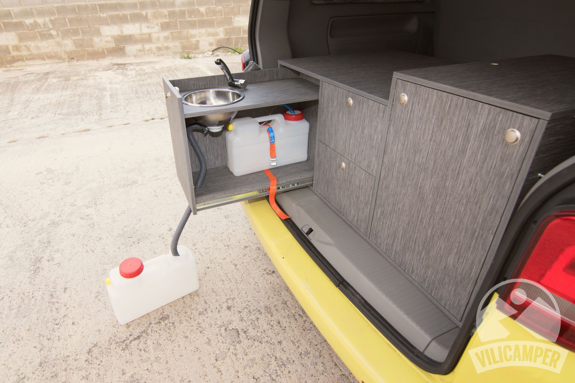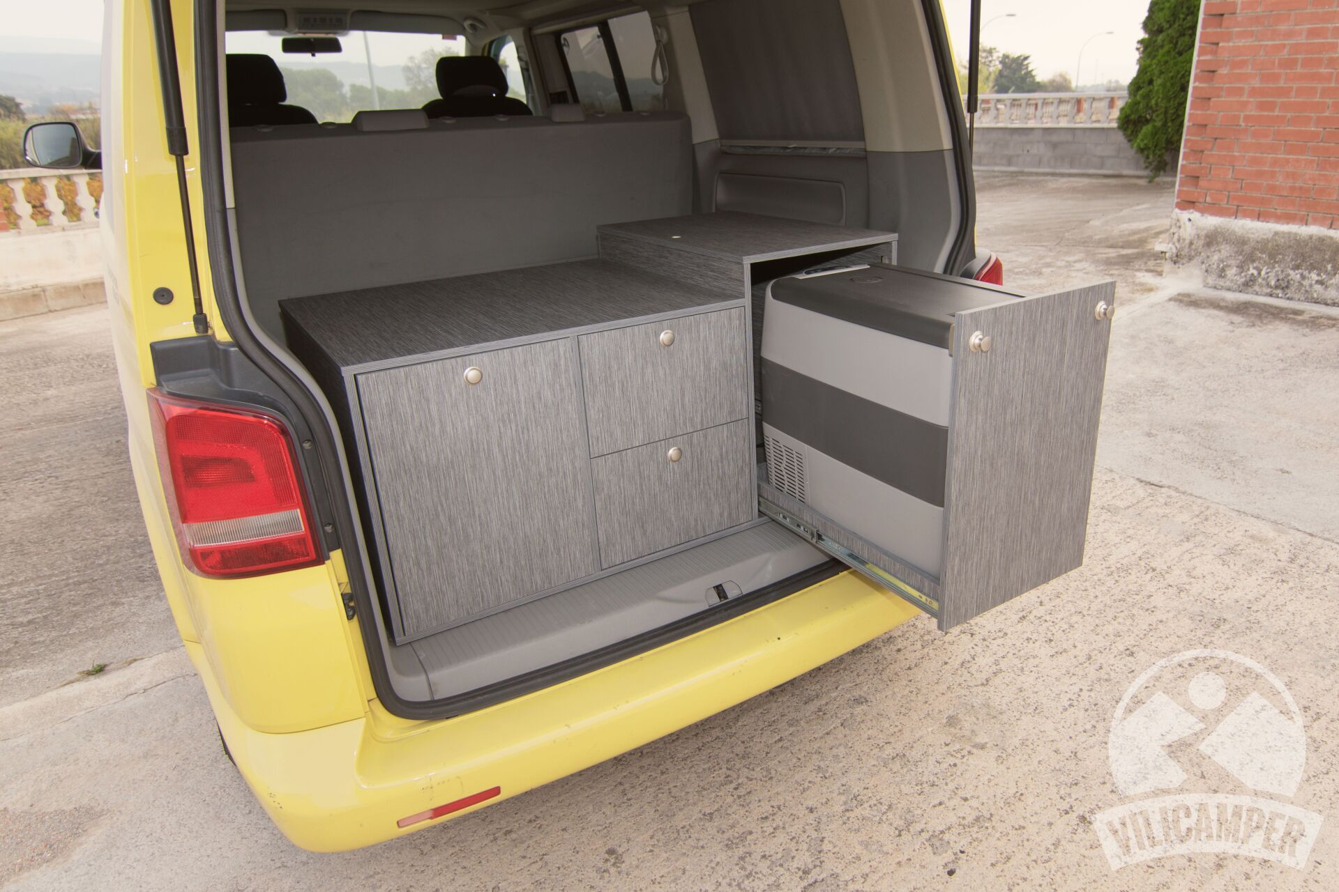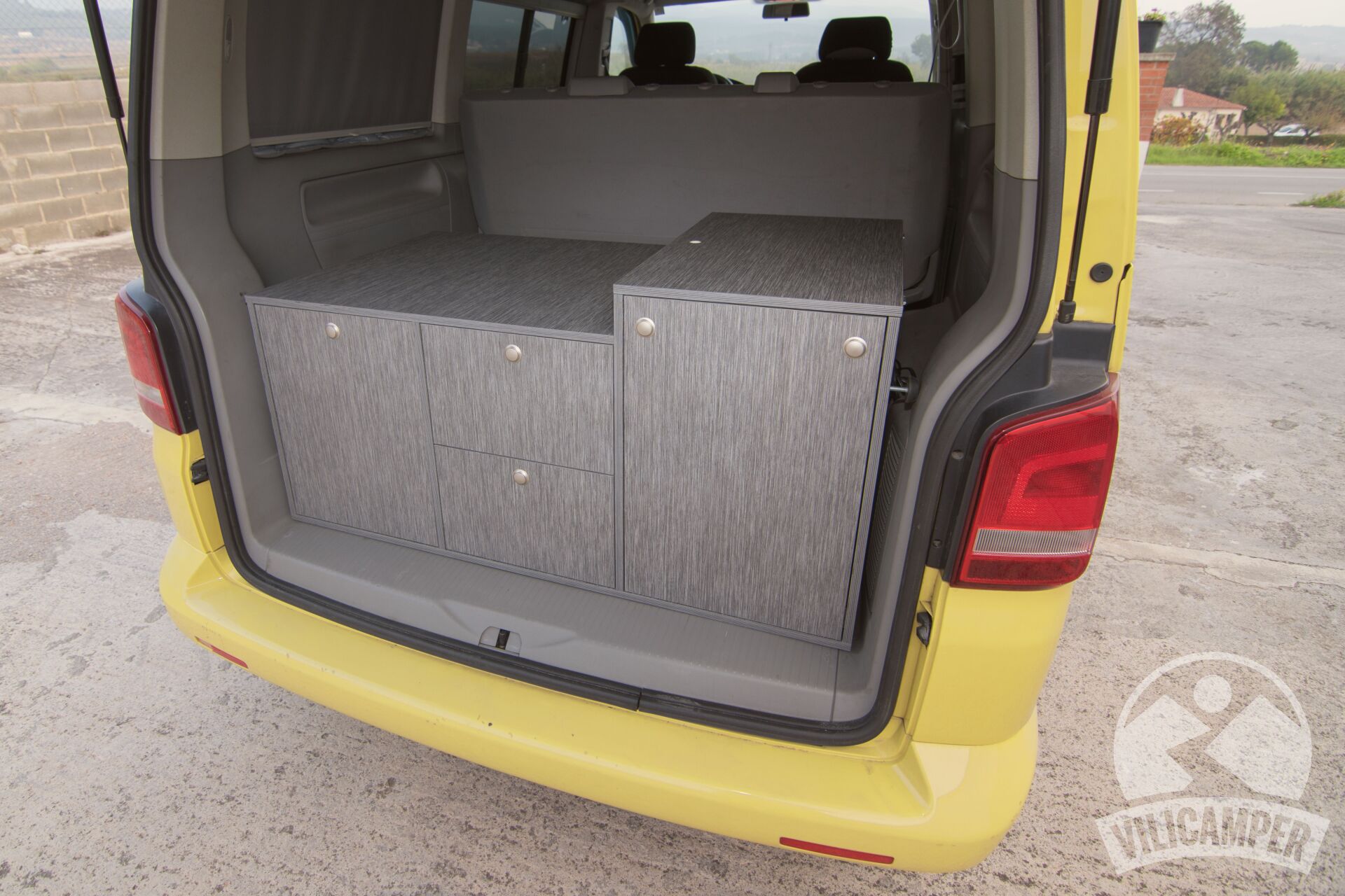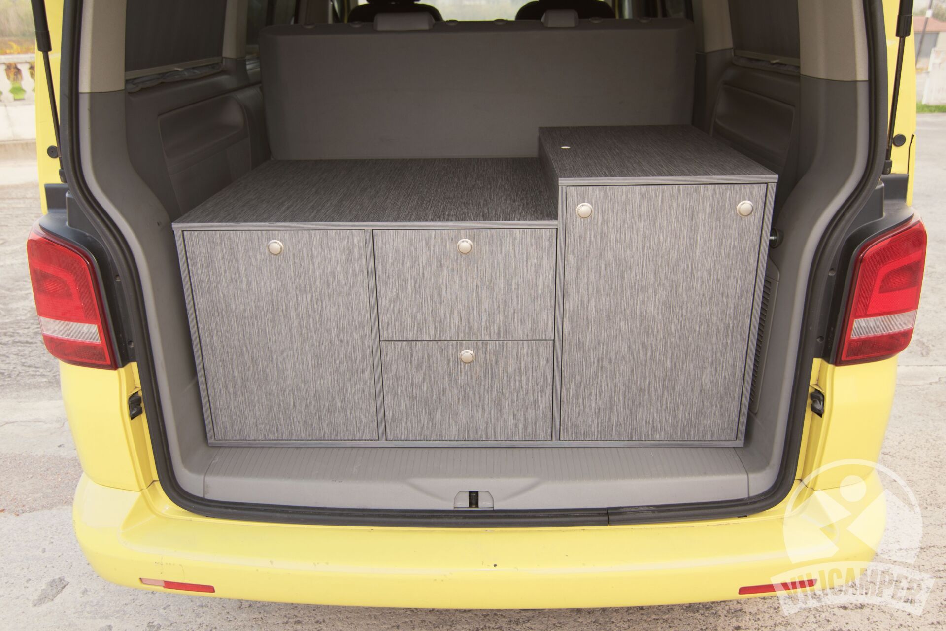 En aquesta ocasió hem fabricat un kit camper per a una Volkswagen California Beach totalment a les mesures requerides pel client per aprofitar la nevera que ja tenien, alhora hem afegit una pràctica aigüera amb mini dipòsits d'aigua i calaixos d'emmagatzematge.
