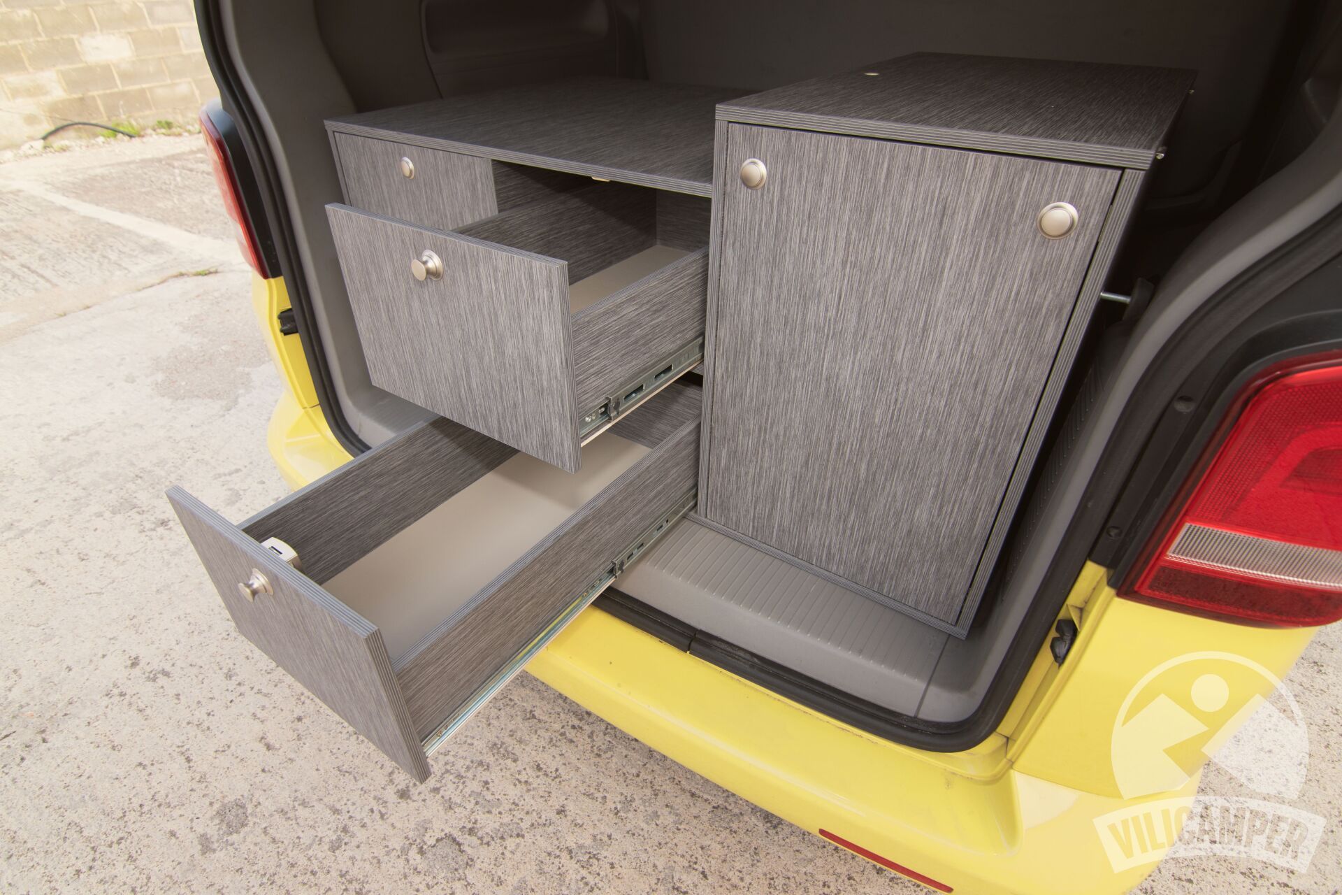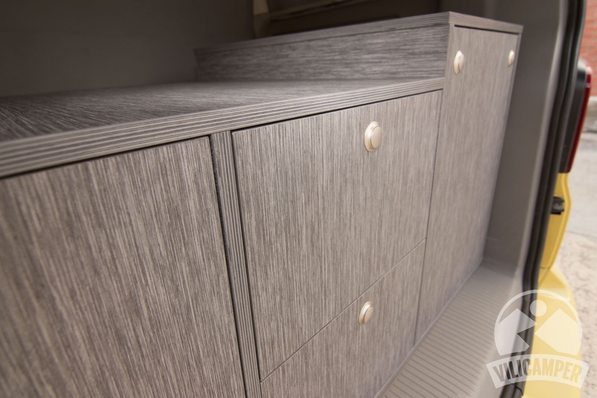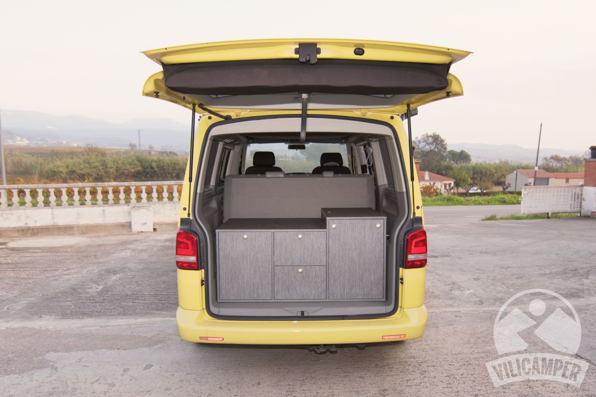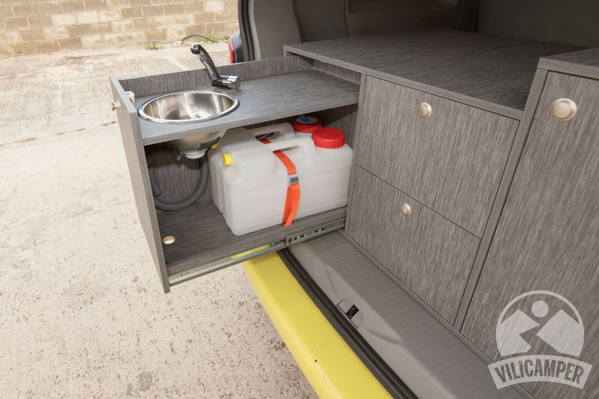En aquesta ocasió hem fabricat un kit camper per a una Volkswagen California Beach totalment a les mesures requerides pel client per aprofitar la nevera que ja tenien, alhora hem afegit una pràctica aigüera amb mini dipòsits d'aigua i calaixos d'emmagatzematge.