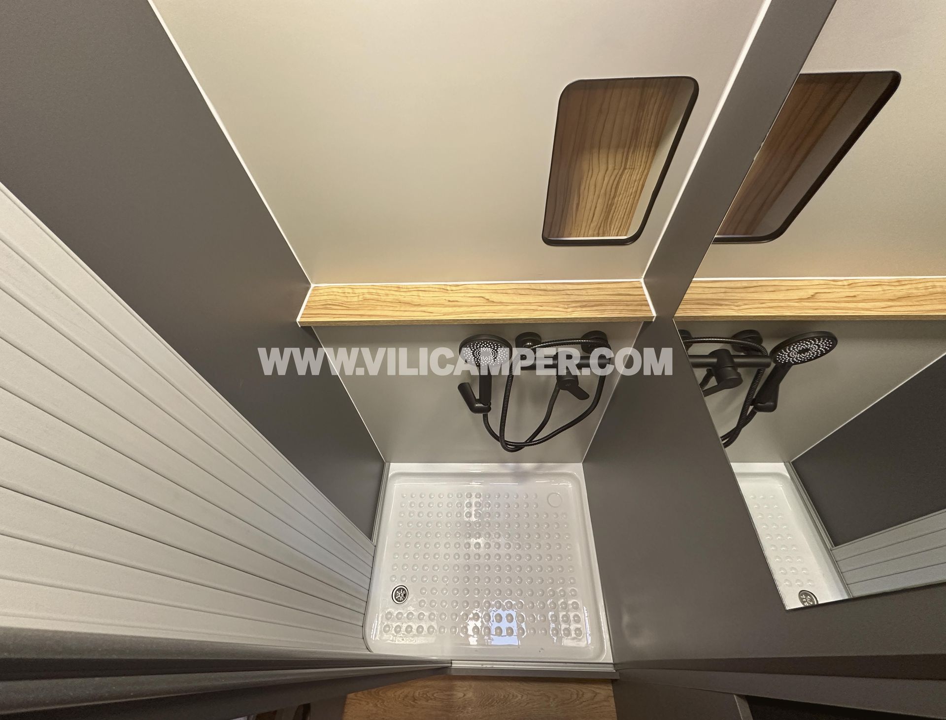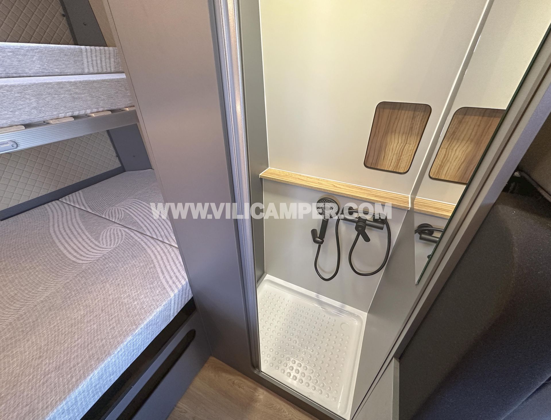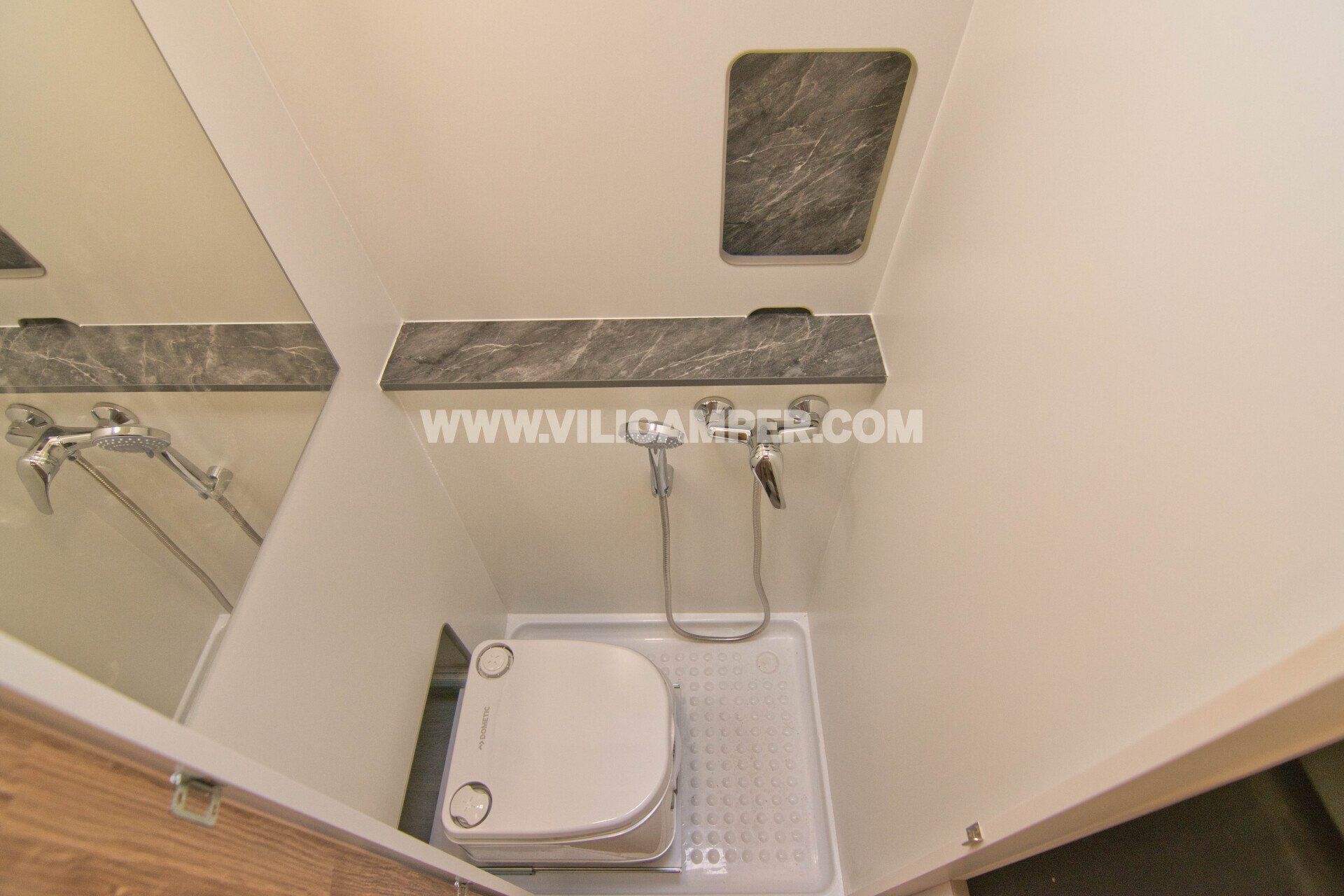 Nota: Las fotos actuales del baño no corresponden exactamente al diseño estándar del vehículo. En el modelo estándar, la puerta es de madera, no corredera como se muestra en las imágenes. Además, incluye un potty Dometic 972 integrado de forma práctica y discreta detrás de un compartimento con persiana de PVC. Este diseño optimiza el espacio, ofreciendo un baño amplio y cómodo.