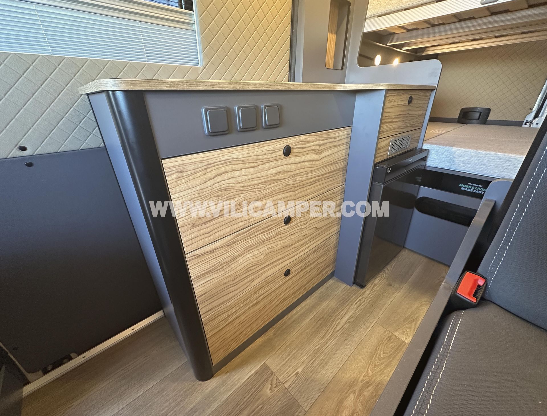 - Personalización de acabados sin coste adicional: Ofrecemos la opción de elegir los colores del suelo, maderas, tiradores y grifería para que puedas personalizar la camperización a tu gusto.