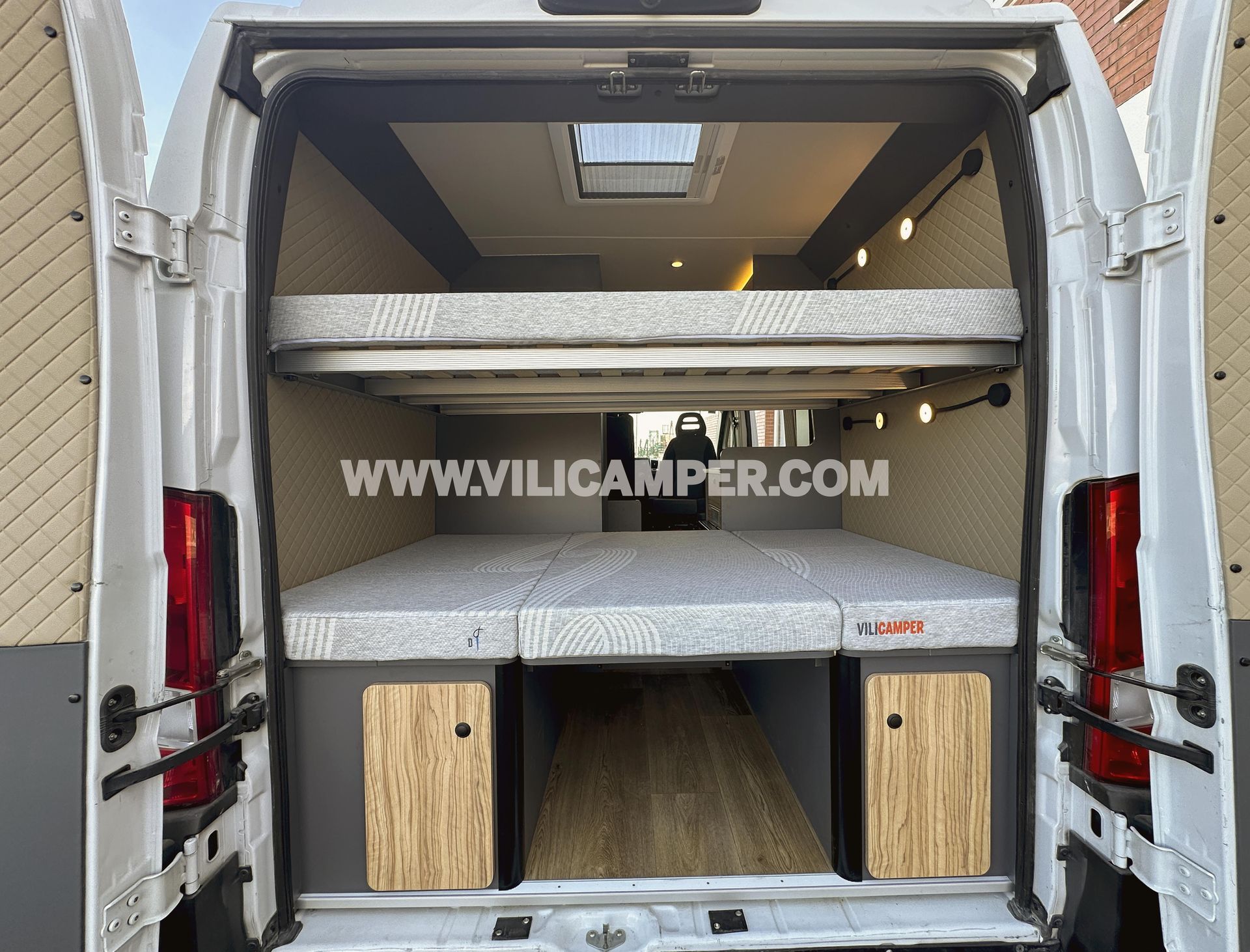 - Posibilidad de añadir extras: Además de nuestra camperización estándar, puedes añadir accesorios y mejoras. Te decimos los más comunes: Toldo, mosquitera en la puerta corredera, aire acondicionado, ventanas adicionales, batería de litio, booster, ducha exterior, escalón eléctrico, fundas asientos delanteros individuales, luz exterior, mueble de baño y lavabo, altillo extra en dormitorio, cierres de seguridad, entre otros. Consulta los precios de cada uno.