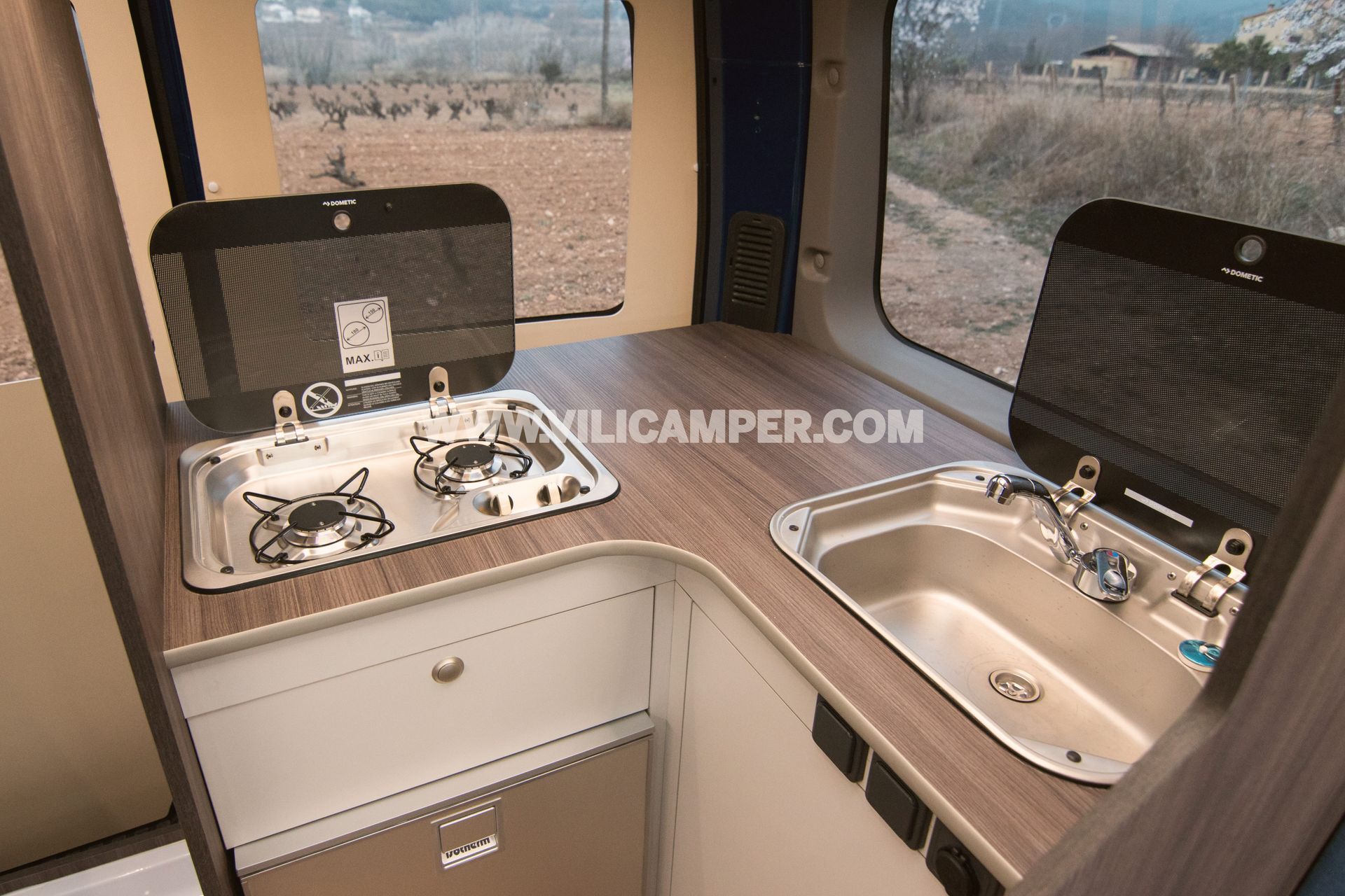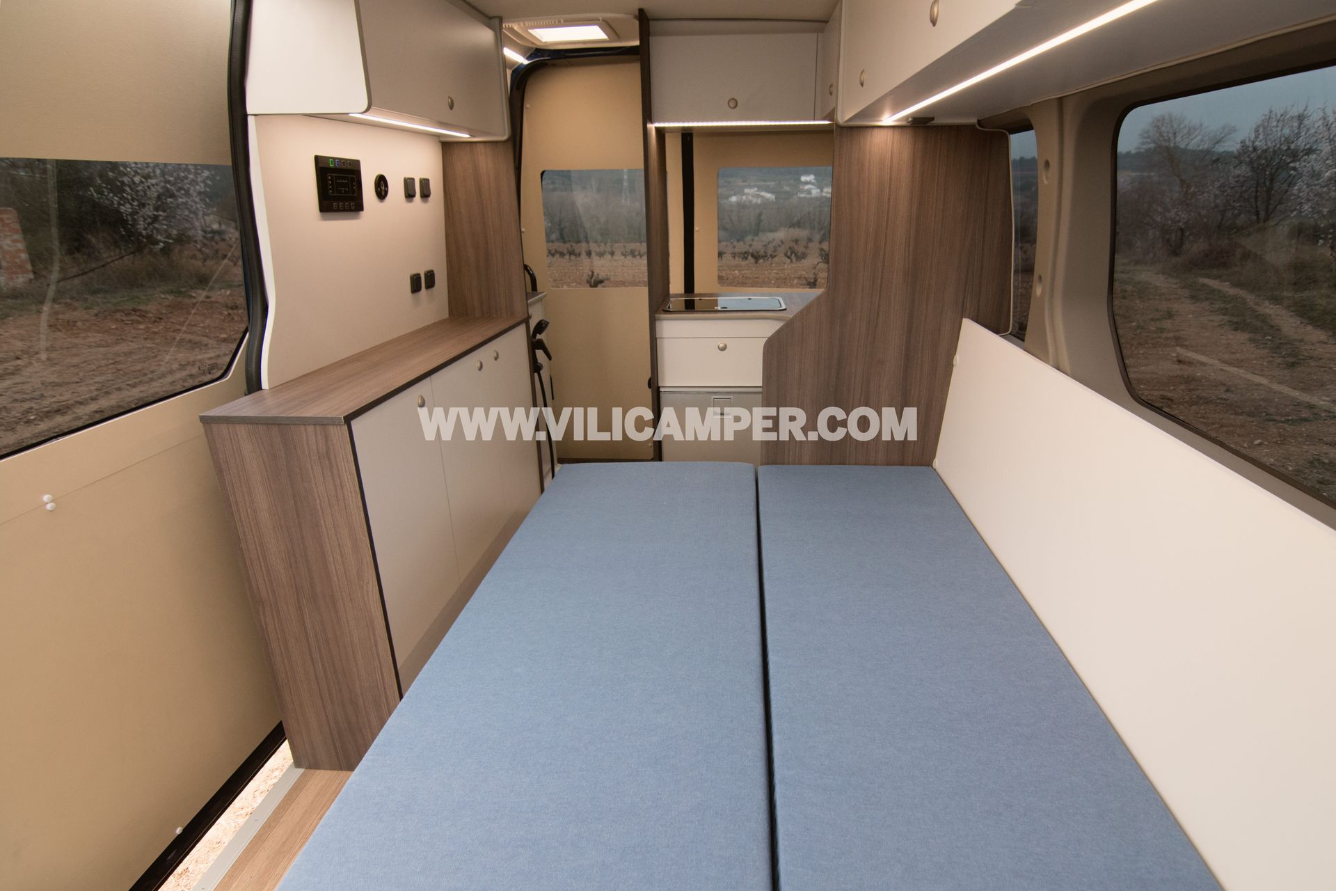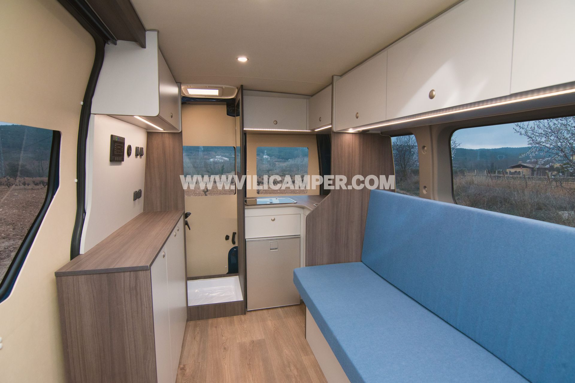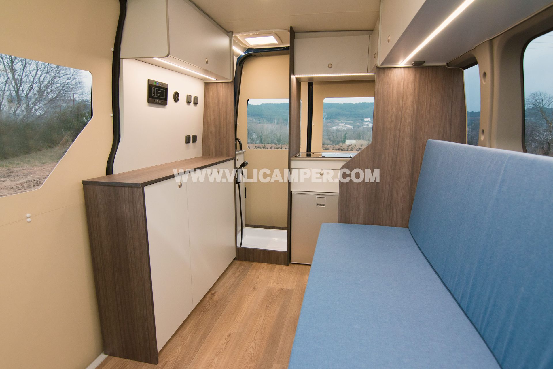 La equipación completa incluye la instalación de una segunda batería en el vehículo para alimentar los dispositivos eléctricos de la casa rodante y disponer de iluminación interior de bajo consumo energético, junto con una centralita para controlar el nivel de carga de baterías, nivel de depósitos de aguas y bomba. Además, tiene una cocina totalmente equipada, con fogones, fregadero y nevera.