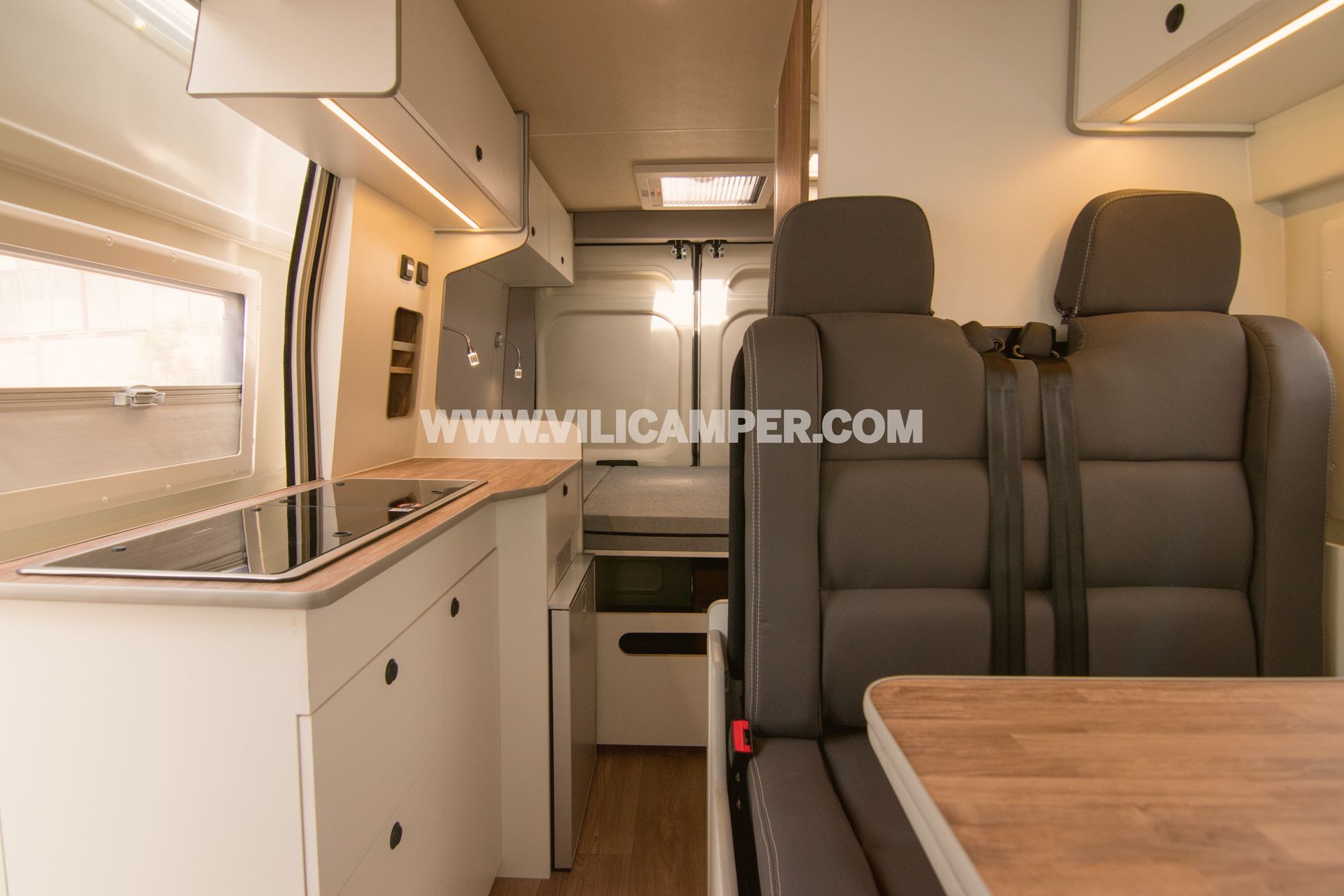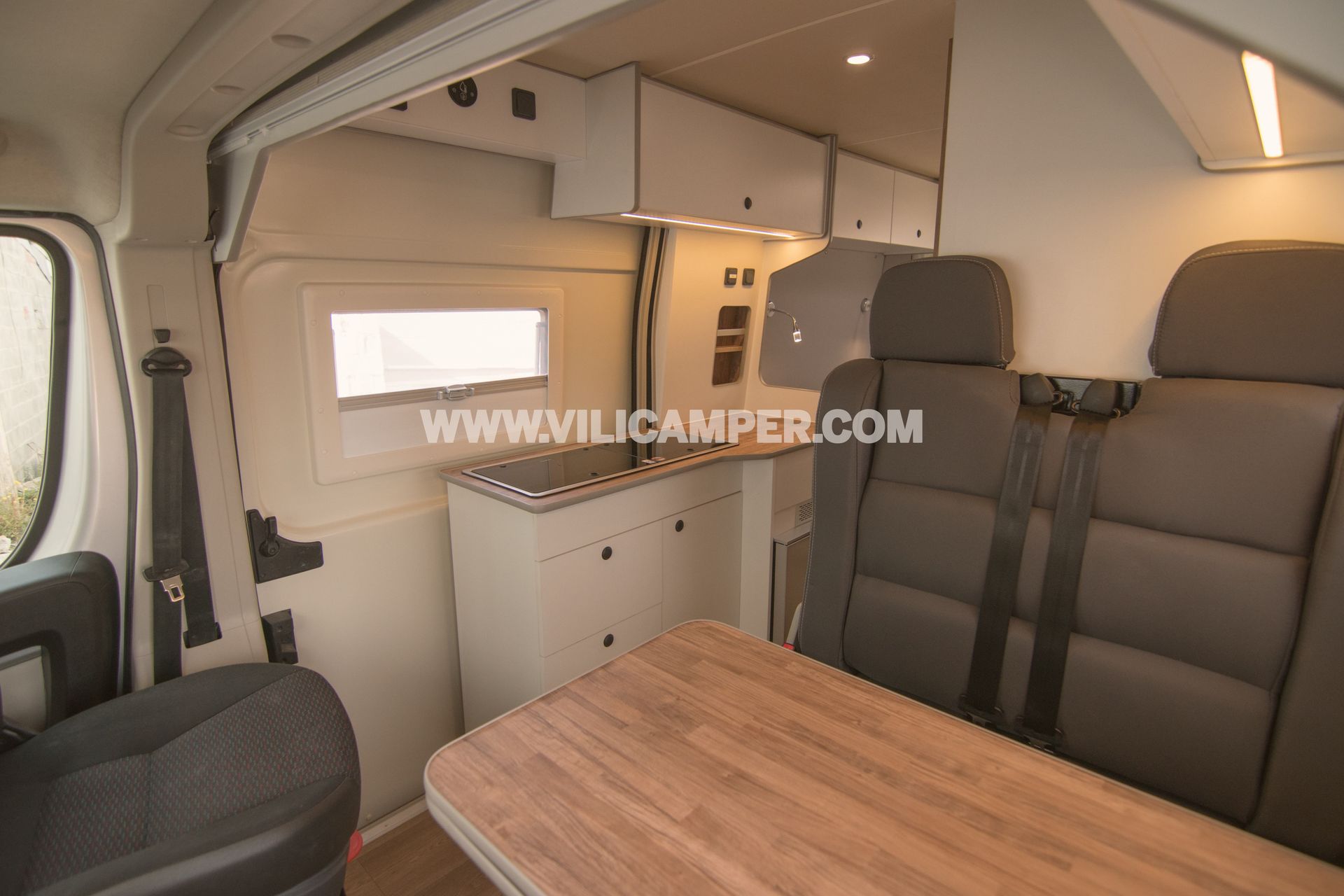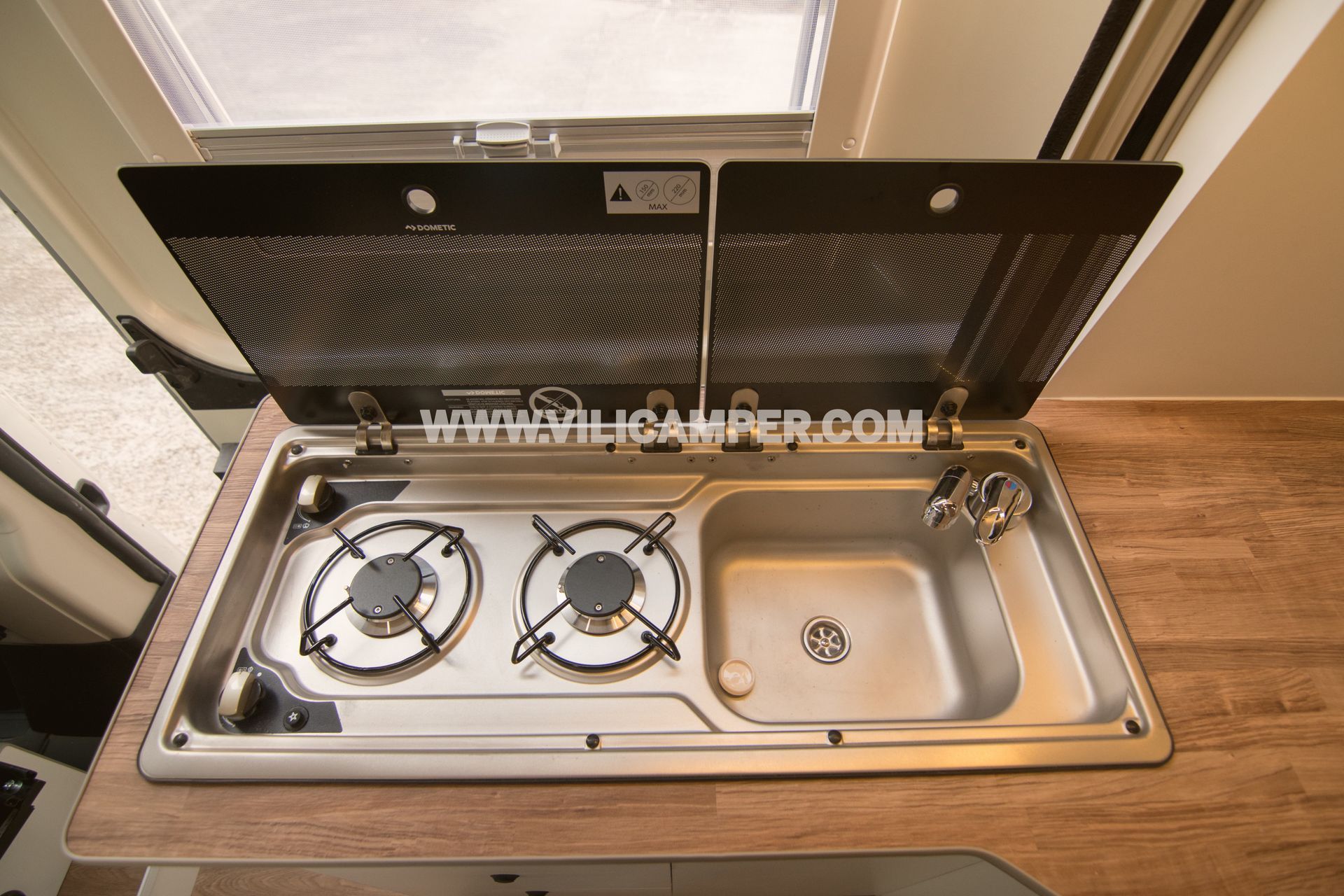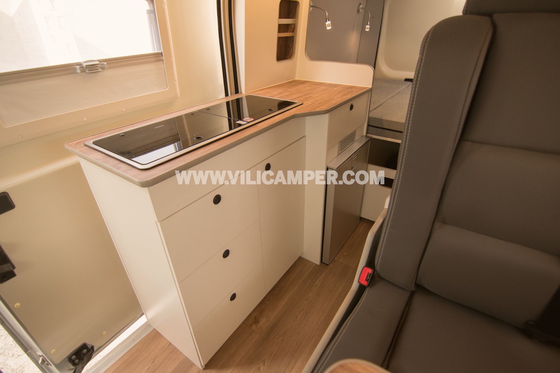 - Cocina funcional y nevera: Equipamos la camperización con una cocina compacta de dos quemadores a gas y un fregadero incorporado. También incluimos una nevera de compresor de tamaño adecuado para mantener tus alimentos frescos durante todo el viaje.