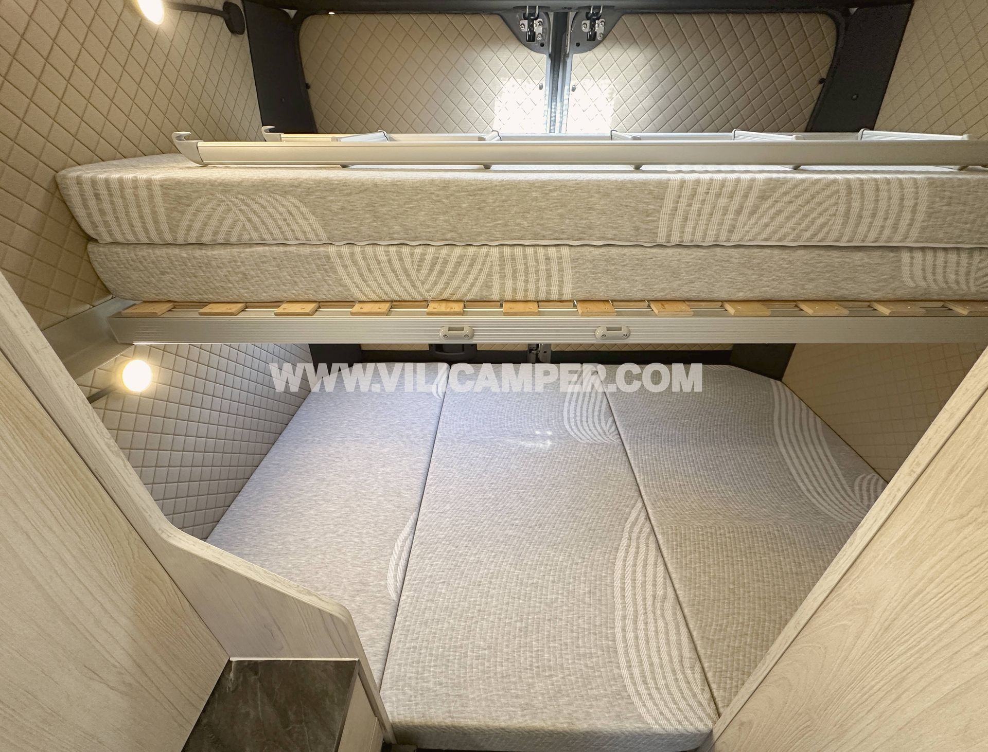- Cama inferior tipo arcón con accesos por ambos lados y ala central abatible