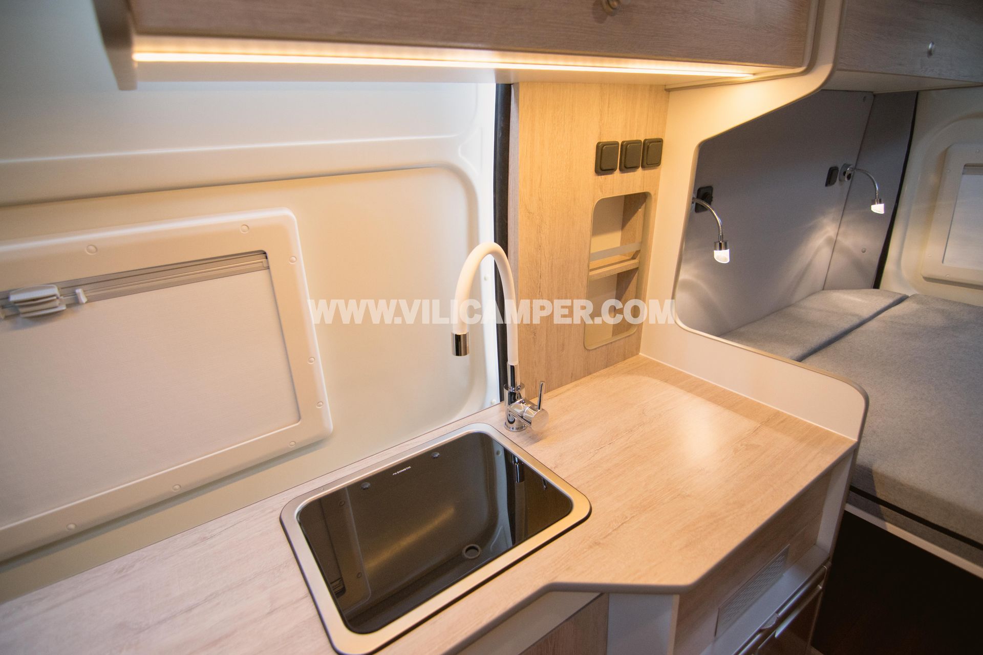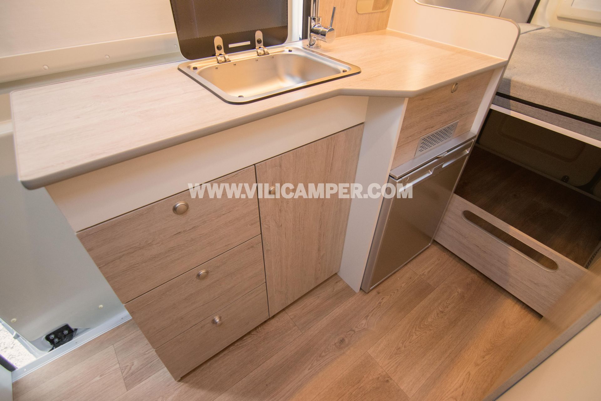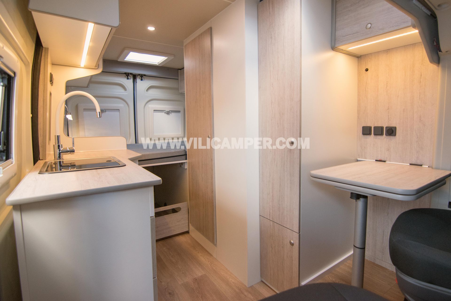 En respuesta a tus necesidades de almacenamiento, hemos incluido un armario ropero espacioso. Este detalle adicional proporciona un espacio dedicado para colgar y organizar tu ropa, permitiéndote llevar contigo todo lo que necesitas para tus viajes. Aunque no cuenta con una cocina fija, el fregadero funcional complementa tu experiencia, facilitando la preparación de comidas sencillas y manteniendo la limpieza en tu hogar sobre ruedas.