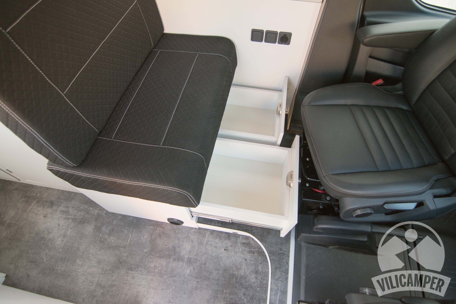 Asientos y Bases: Instalamos bases giratorias en los asientos delanteros para mayor amplitud y comodidad. La estructura trasera está fabricada de madera, ofrece un espacio extra en el salón, pero no es apto para viajar, ya que no dispone de cinturones de seguridad.