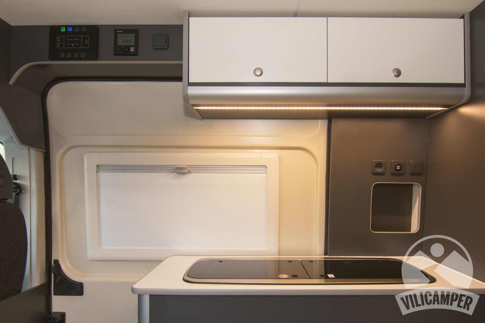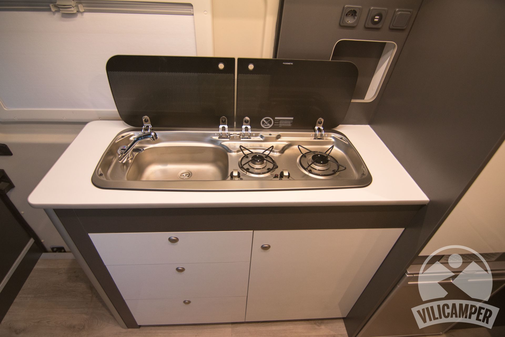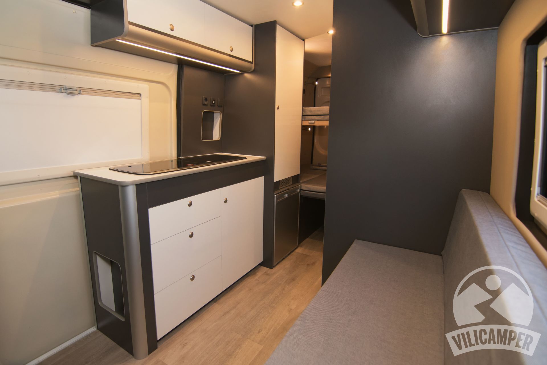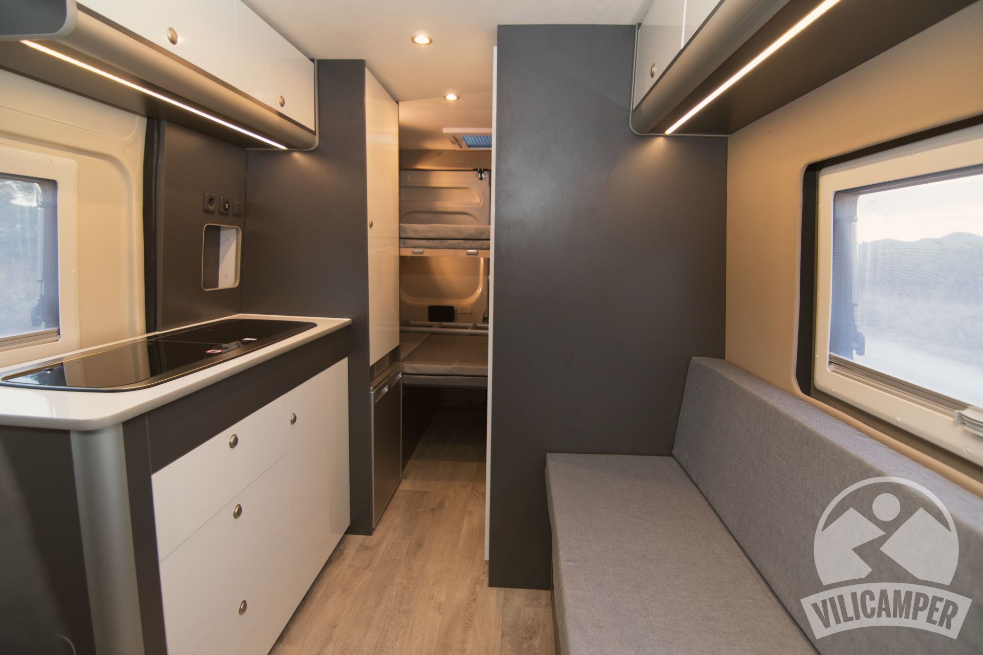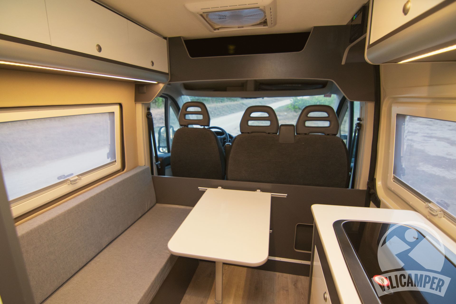 Equipación completa para dormir 4 adultos con una amplia zona de comedor y mesa convertible en sofá Ches Long con arcones amplios para el almacenaje.
