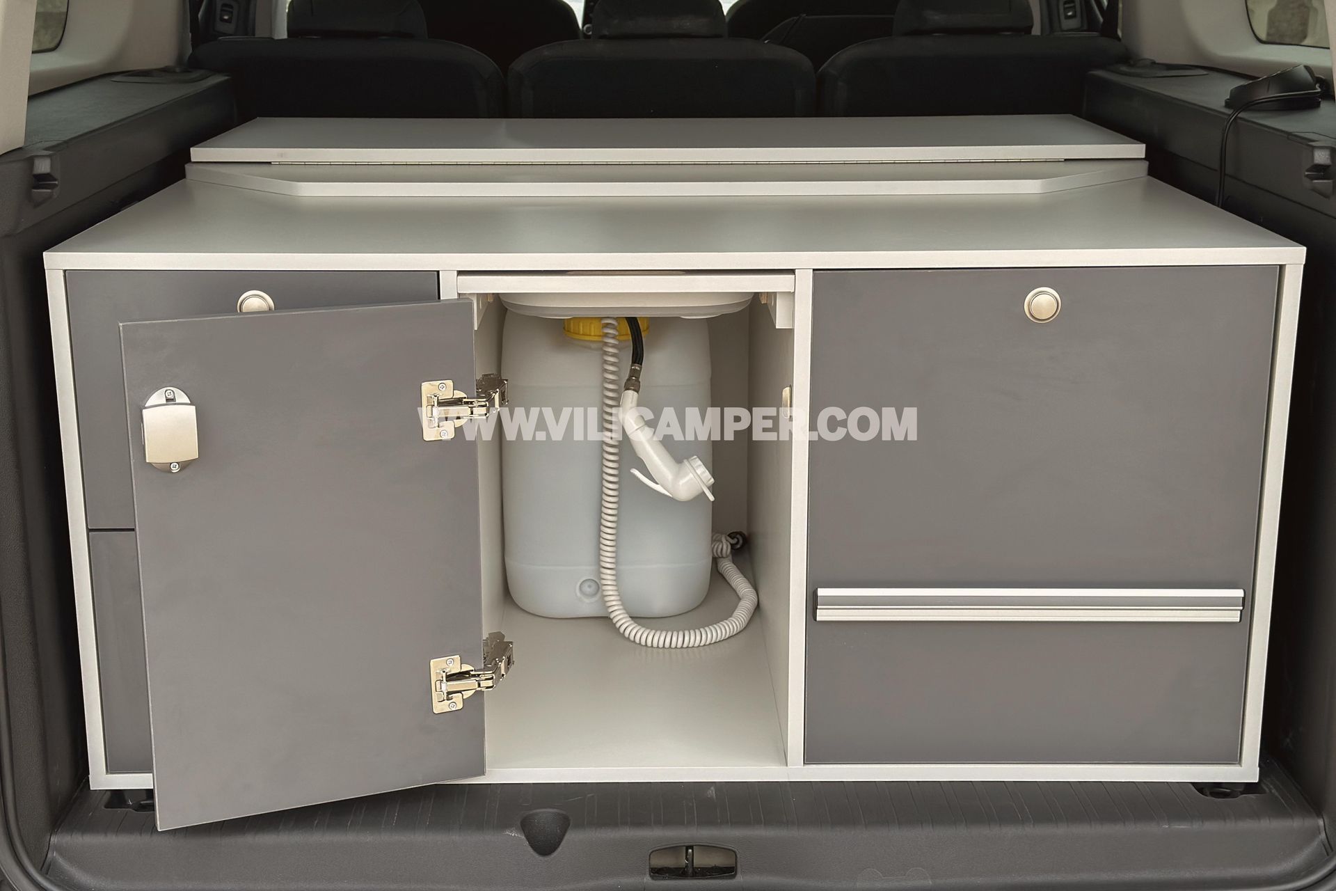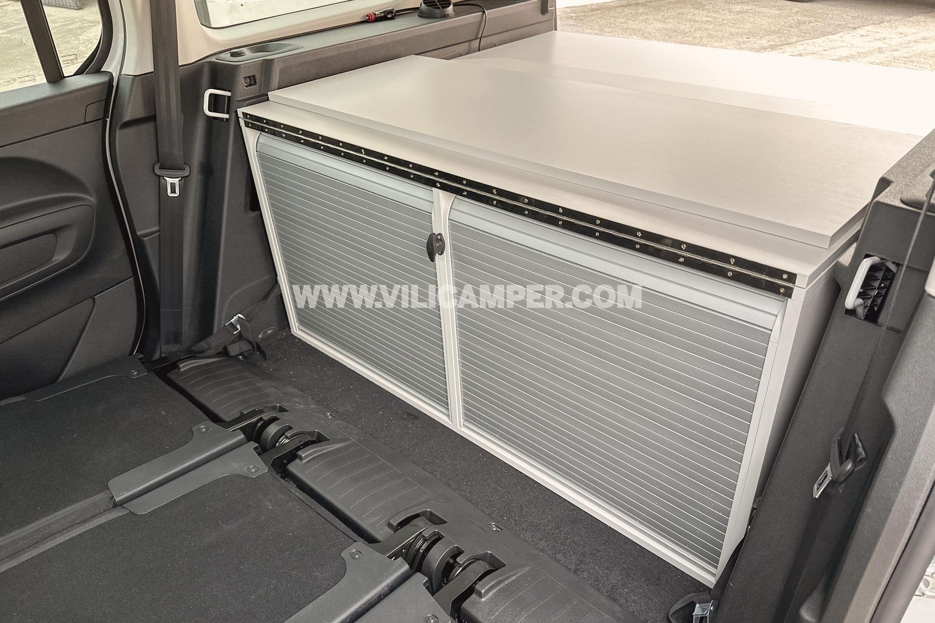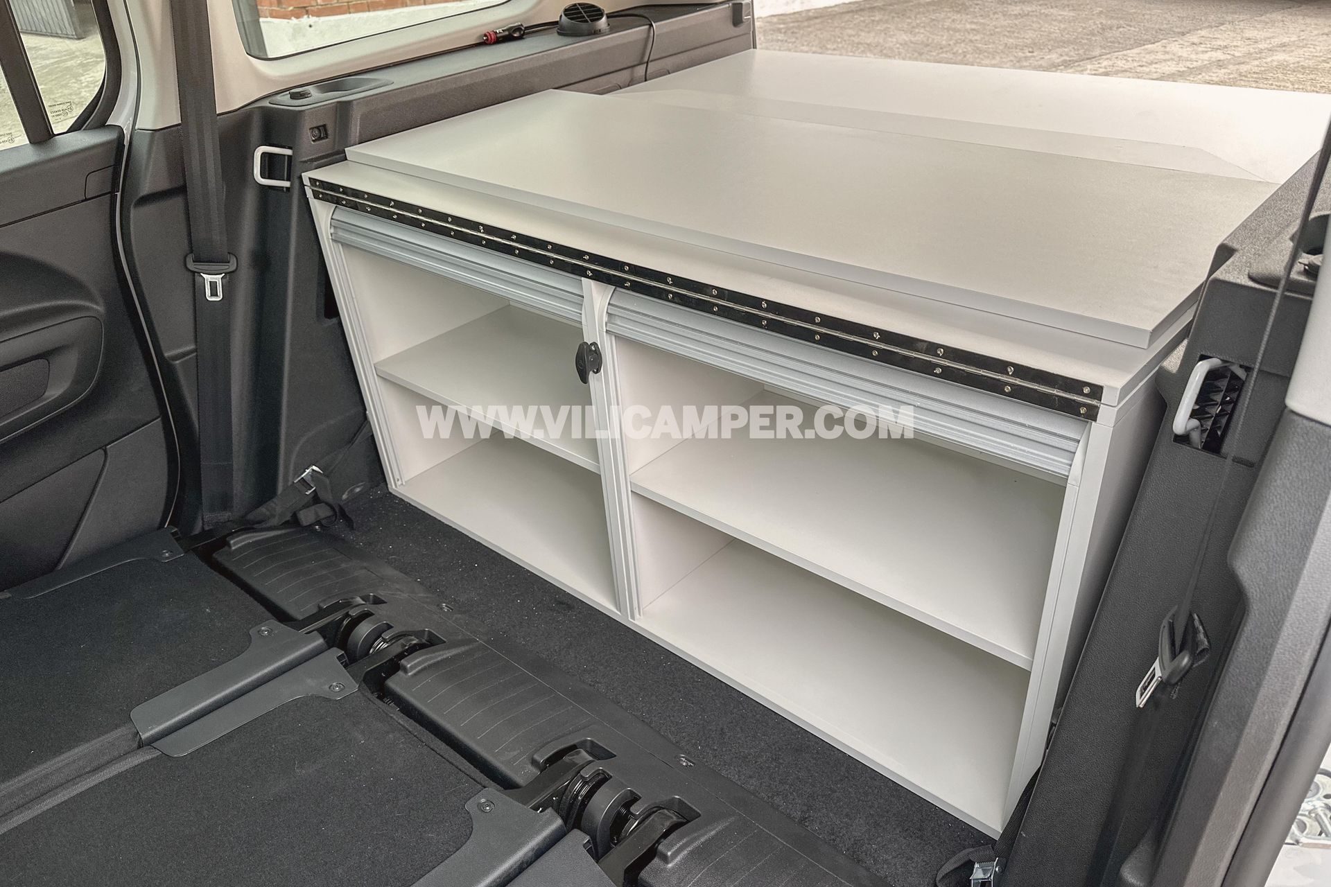 - Almacenamiento Organizado: Con cajones de almacenamiento y armarios traseros, nuestro kit asegura que cada artículo tenga su lugar designado. La persiana y estanterías en los armarios permiten un acceso fácil y organizado a tus pertenencias, manteniendo el espacio ordenado incluso durante tus viajes más aventureros.