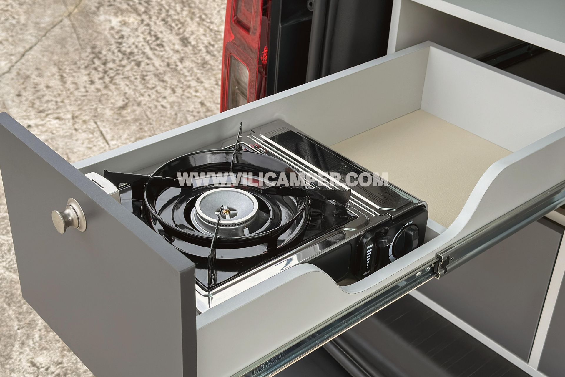 - Cajón Especial para Cocina Portátil: Incluye un cajón especialmente diseñado para albergar una cocina portátil, brindándote la conveniencia de preparar tus comidas favoritas en cualquier lugar.