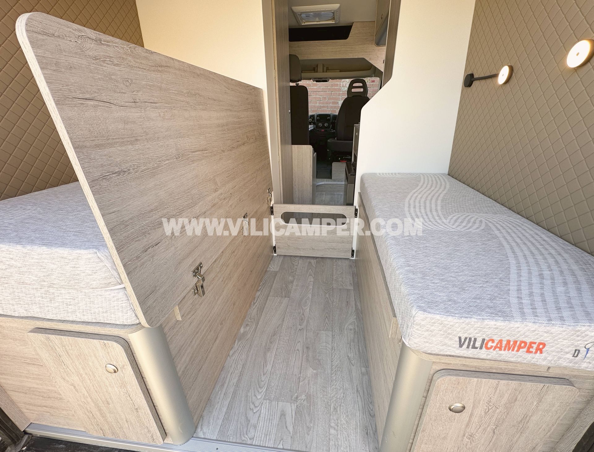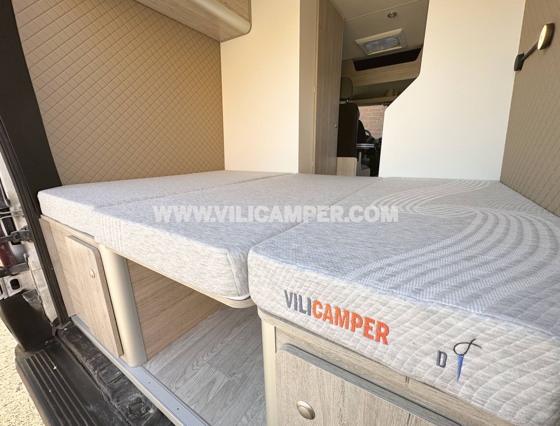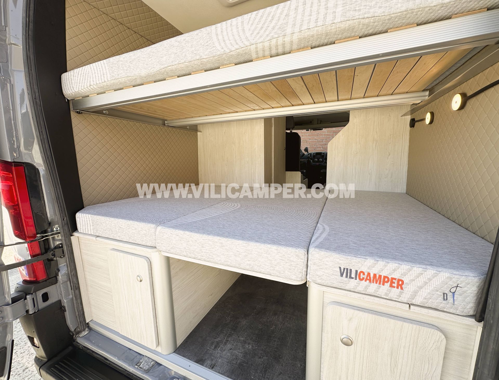 El panelado interior combina materiales de calidad y un acabado moderno: contrachapado CPL beige en techo, suelo vinílico PVC y múltiples paneles tapizados a medida en comedor, portones y puerta corredera.