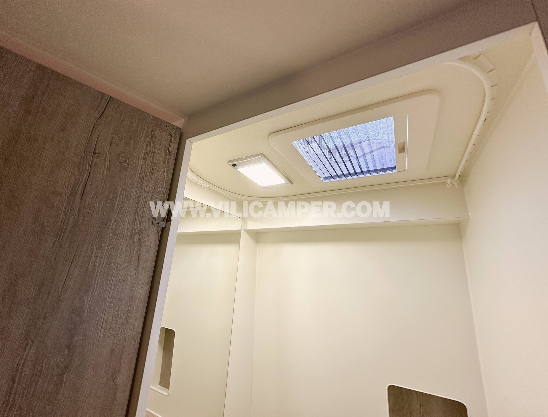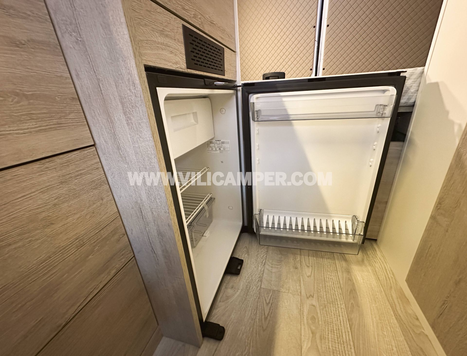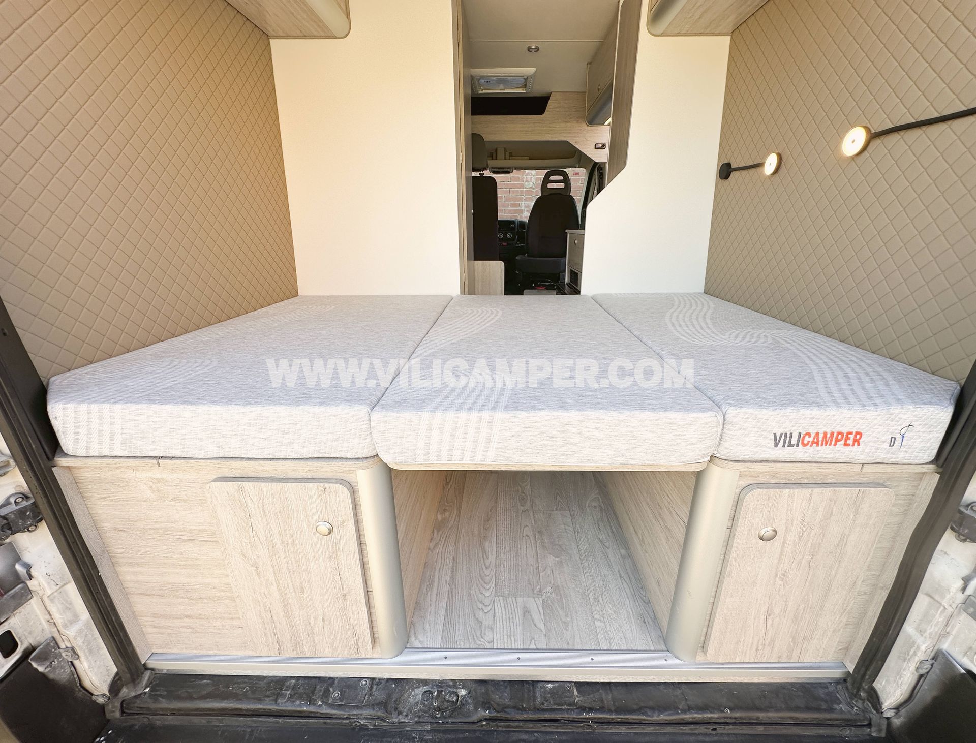 El panelado interior combina materiales de calidad y un acabado moderno: contrachapado CPL beige en techo, suelo vinílico PVC y múltiples paneles tapizados a medida en comedor, portones y puerta corredera.
