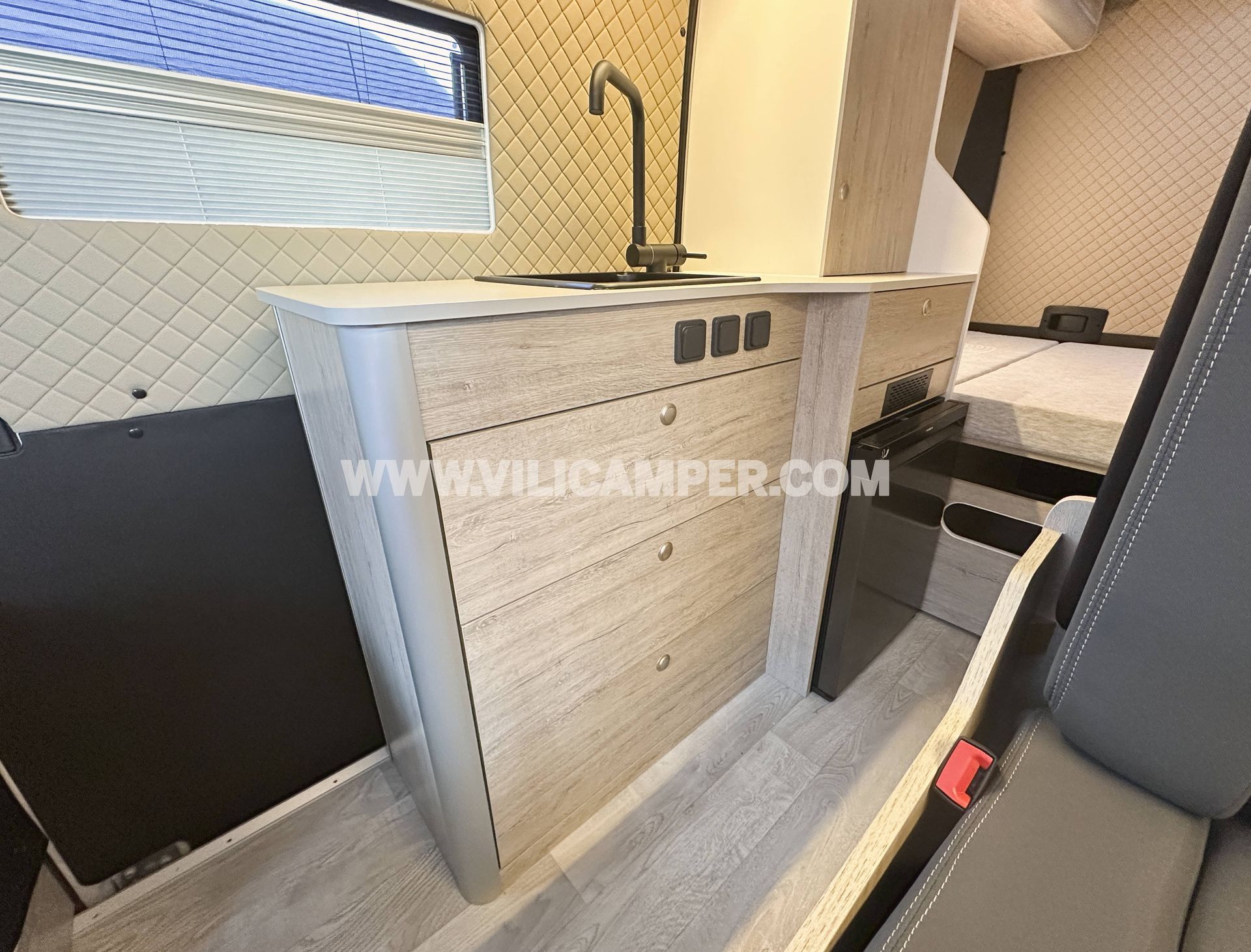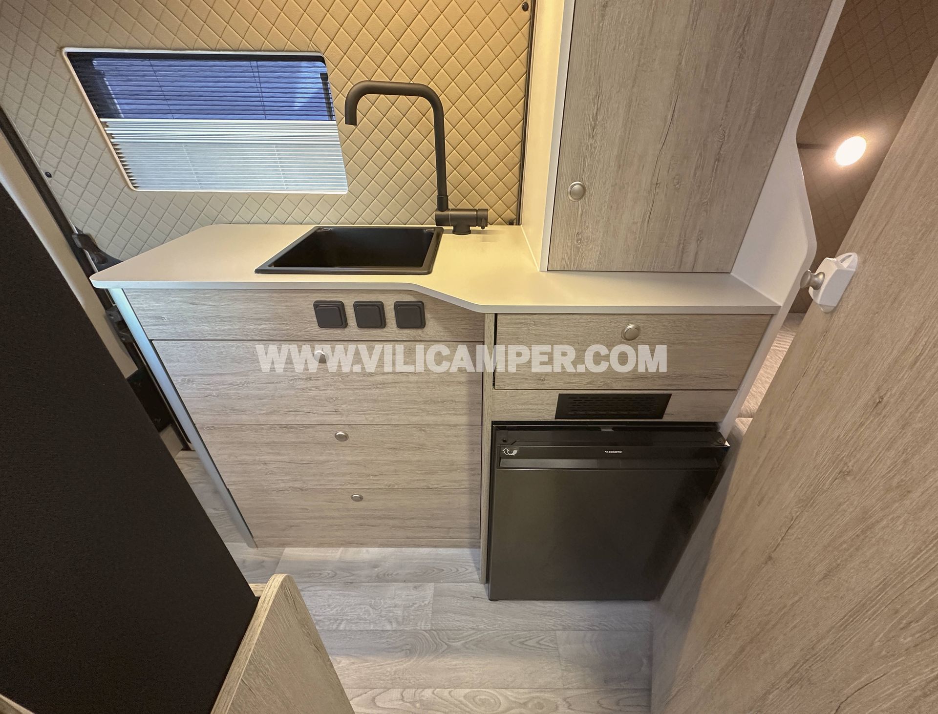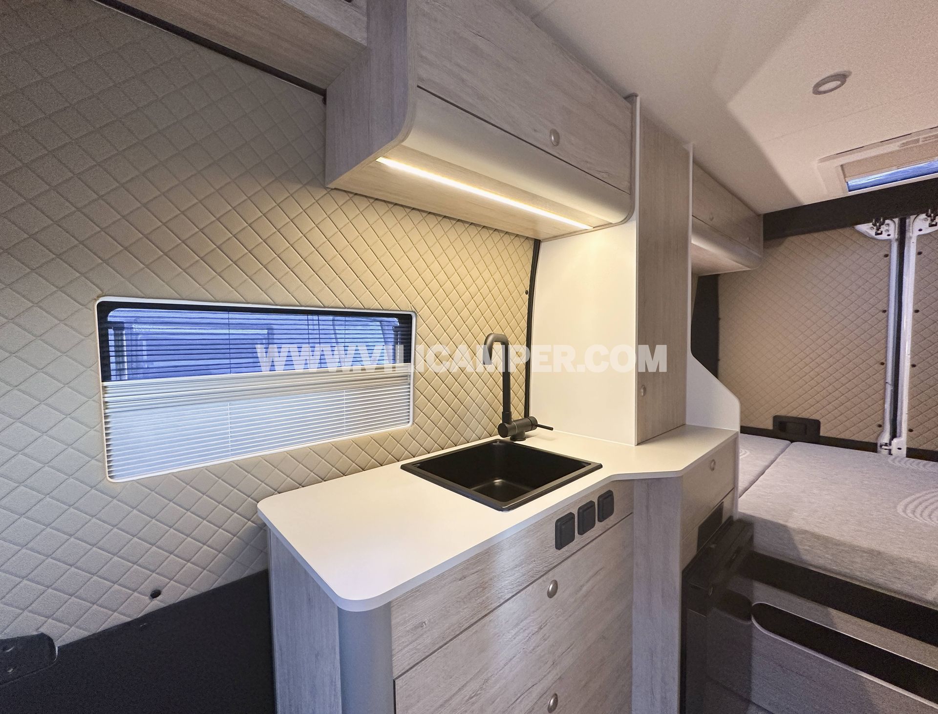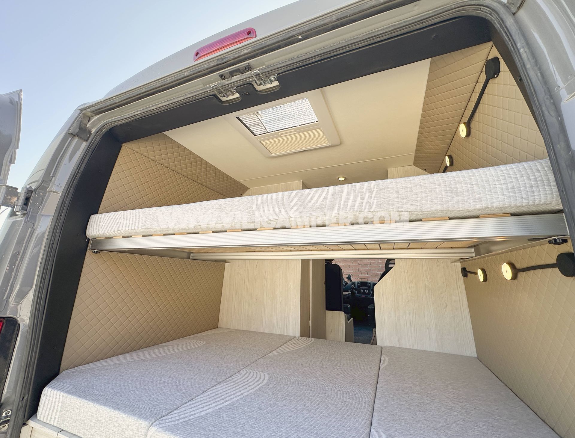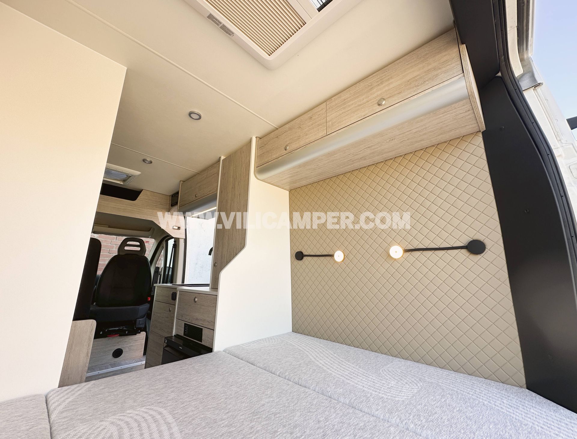 Una camperización estándar que demuestra que menos es más. En este caso, el cliente buscaba una distribución sencilla y funcional, con capacidad para viajar 4 pero dormir 2, priorizando el espacio interior. Esta Peugeot Boxer L2H2 ha sido equipada con todas las comodidades esenciales: baño completo, cama doble , calefacción, agua caliente, instalación eléctrica, fregadero y mobiliario completo.