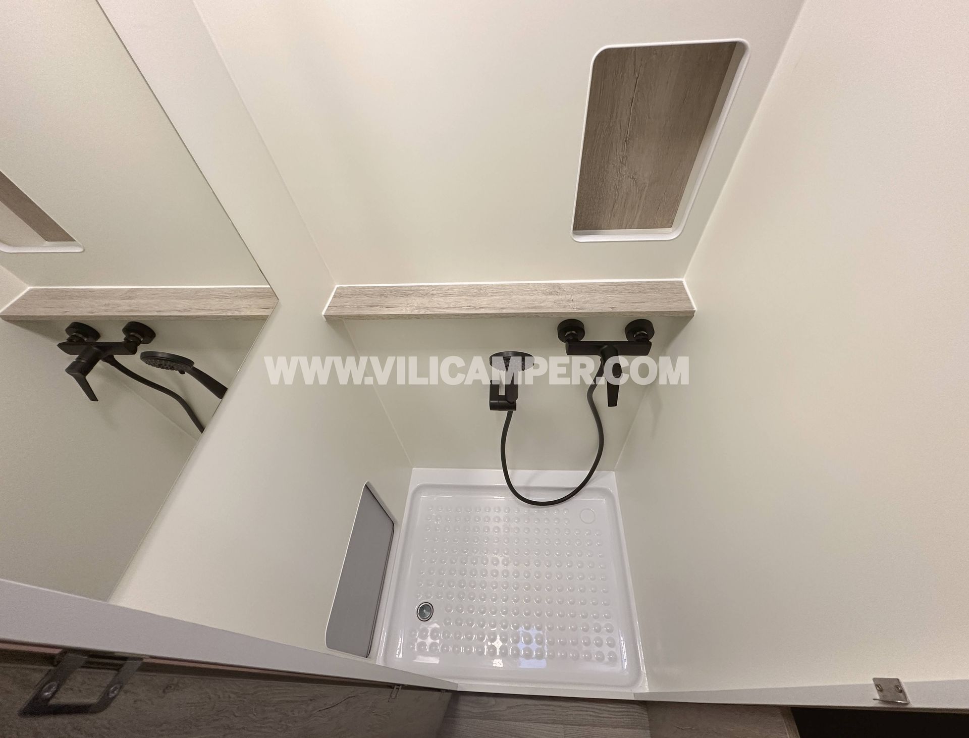 Sistema completo de agua a presión con bomba Shurflo de 10 l/min, depósitos de aguas limpias (80 L) y grises (53 L), vaso de expansión Fiamma, toma exterior con tapa magnética, llave de vaciado y todo el sistema integrado mediante conexiones rápidas John Guest.