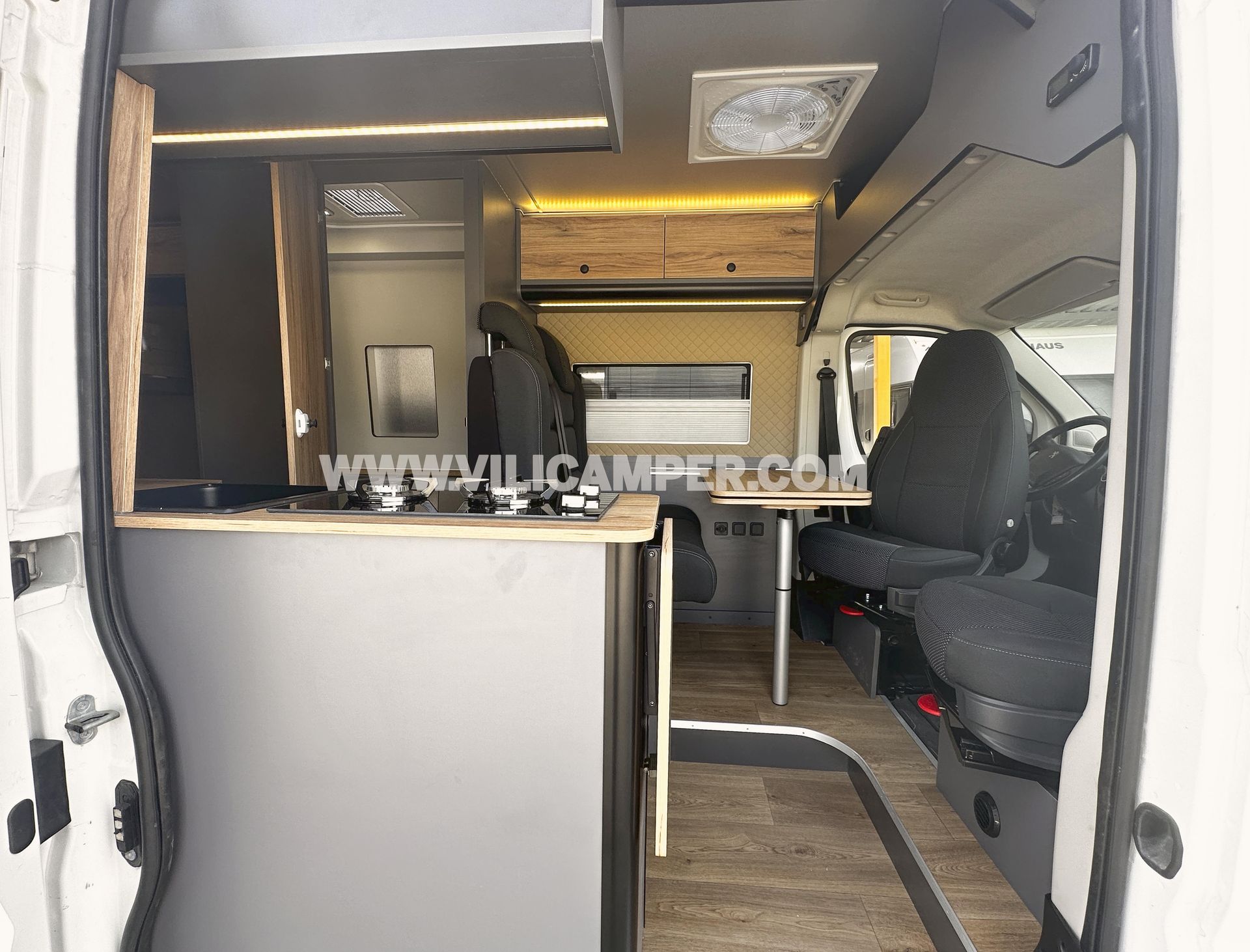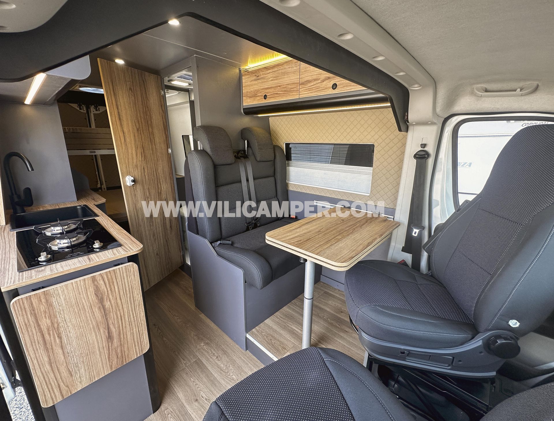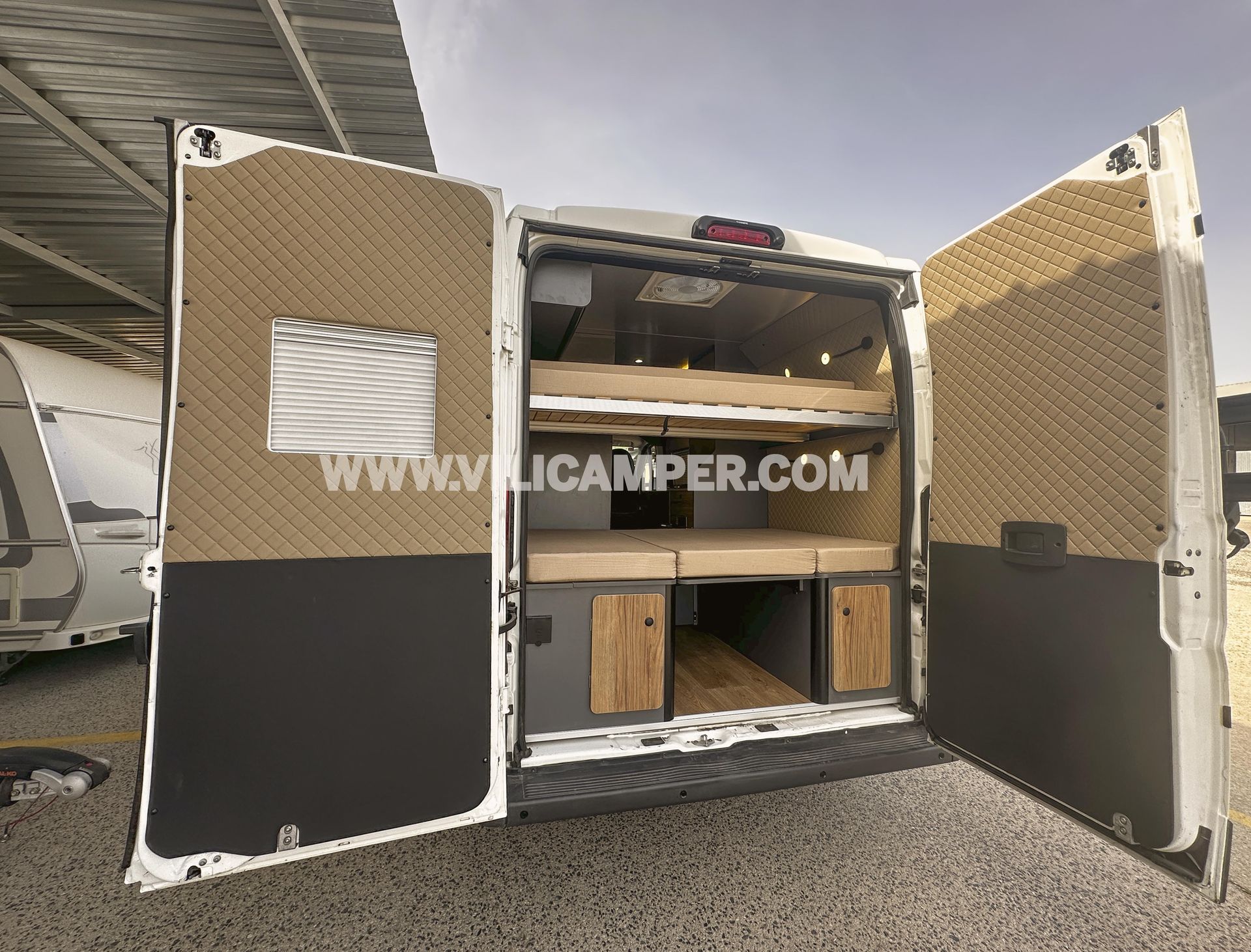 Aislamiento, panelado de suelo, paredes y techo: Aislamiento completo de Kayflex, garantizando una temperatura óptima en todo momento. El suelo está panelado con madera contrachapada de chopo y revestido con vinilo de PVC sin juntas, proporcionando una superficie duradera y fácil de limpiar. Las paredes del dormitorio, la puerta corredera y los portones traseros están tapizados con polipiel, ofreciendo un acabado elegante y fácil de mantener. Además, el techo está panelado con contrachapado efecto polipiel beige, asegurando una construcción robusta y moderna.