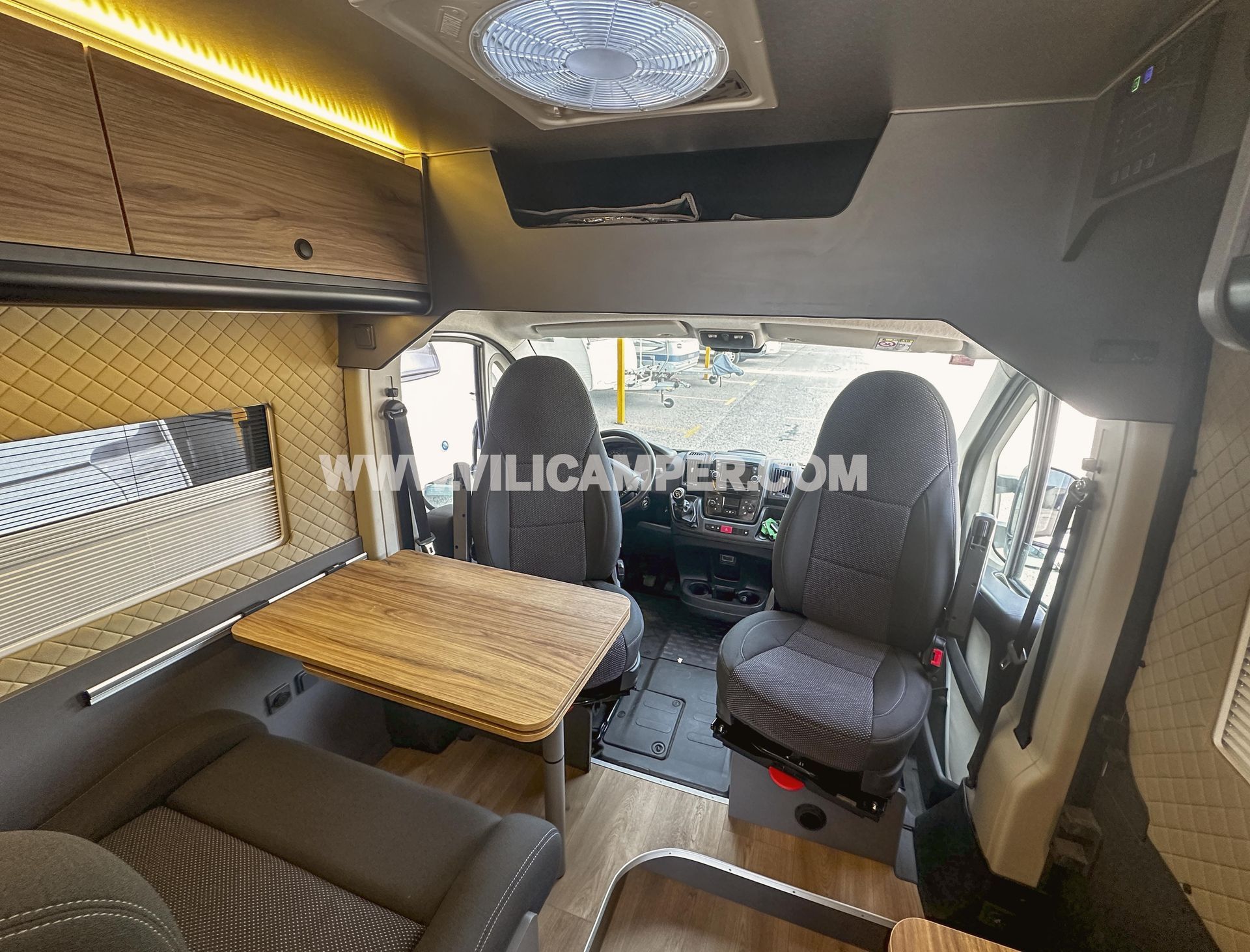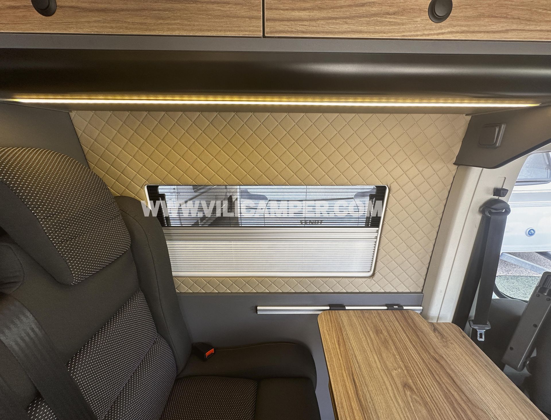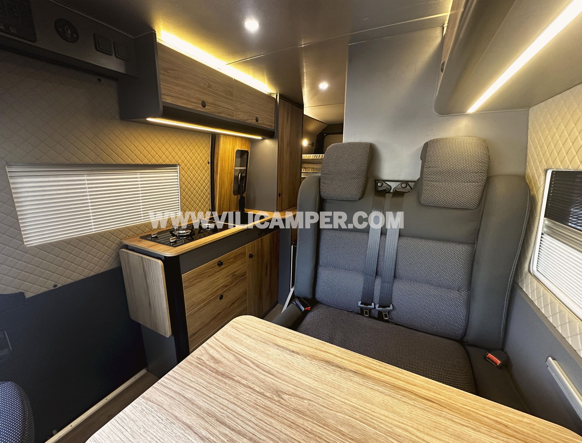 Iluminación: Nuestra configuración de iluminación LED ofrece una luz brillante, acogedora y uniforme en toda la camper. Con lámparas LED en el techo, focos empotrados en los estantes del comedor y la cocina, luces LED superiores que crean un ambiente cálido y confortable y flexo orientables en la zona del dormitorio. Todo el sistema es controlable por zonas para adaptarse a tus necesidades y preferencias de iluminación.
