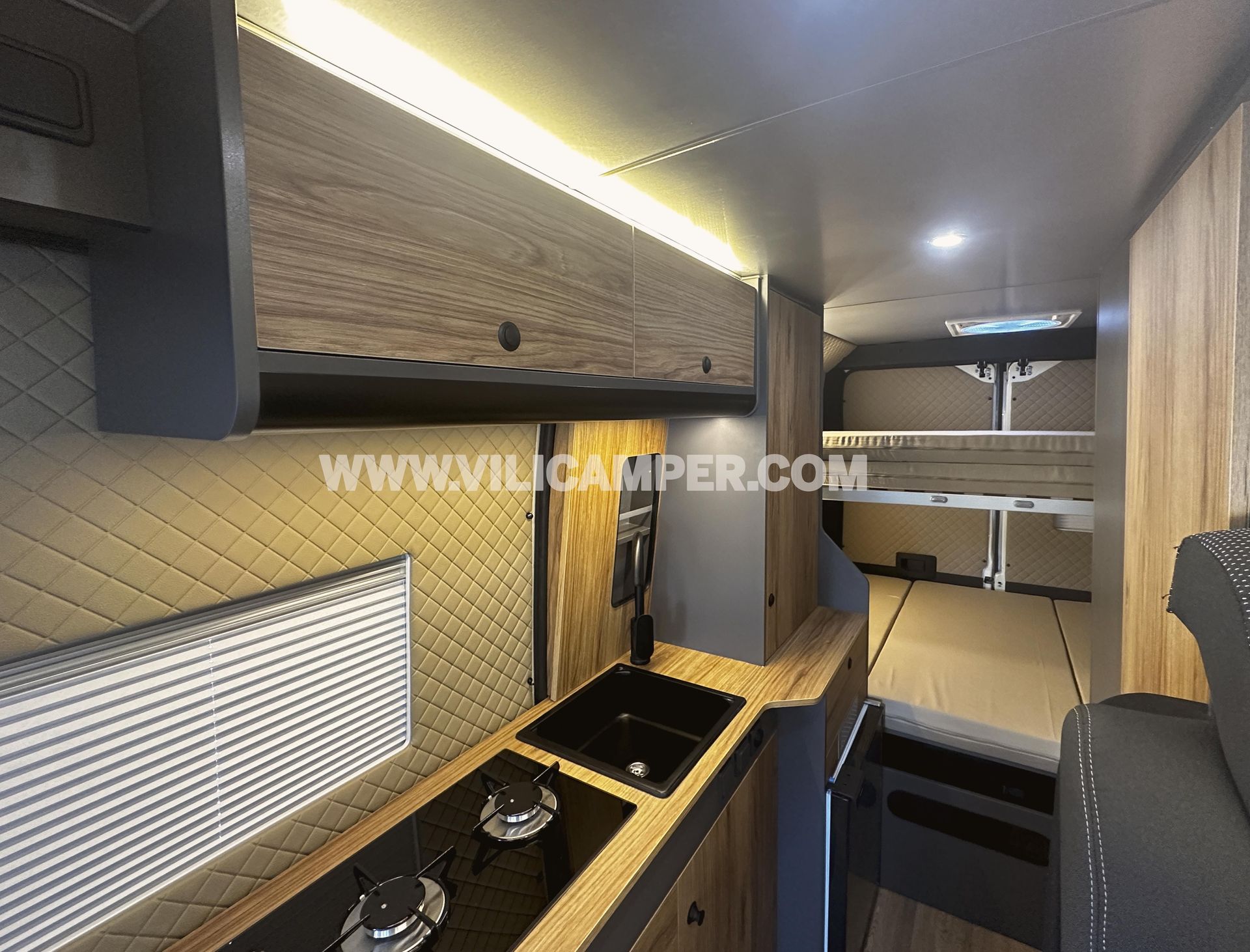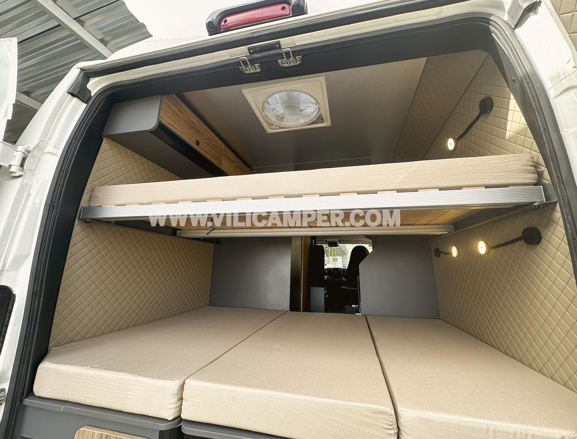 En la parte trasera, las literas están diseñadas para dormir dos personas en cada una. La litera inferior cuenta con un ala central abatible, permitiendo cargar objetos grandes cuando sea necesario. La litera superior se puede plegar para convertirse de dos plazas a una, o incluso desmontarse completamente sin necesidad de herramientas, proporcionando un espacio adicional si no se desea utilizar la litera. Esta versatilidad en las literas permite maximizar el espacio disponible y adaptarlo según las necesidades del momento.