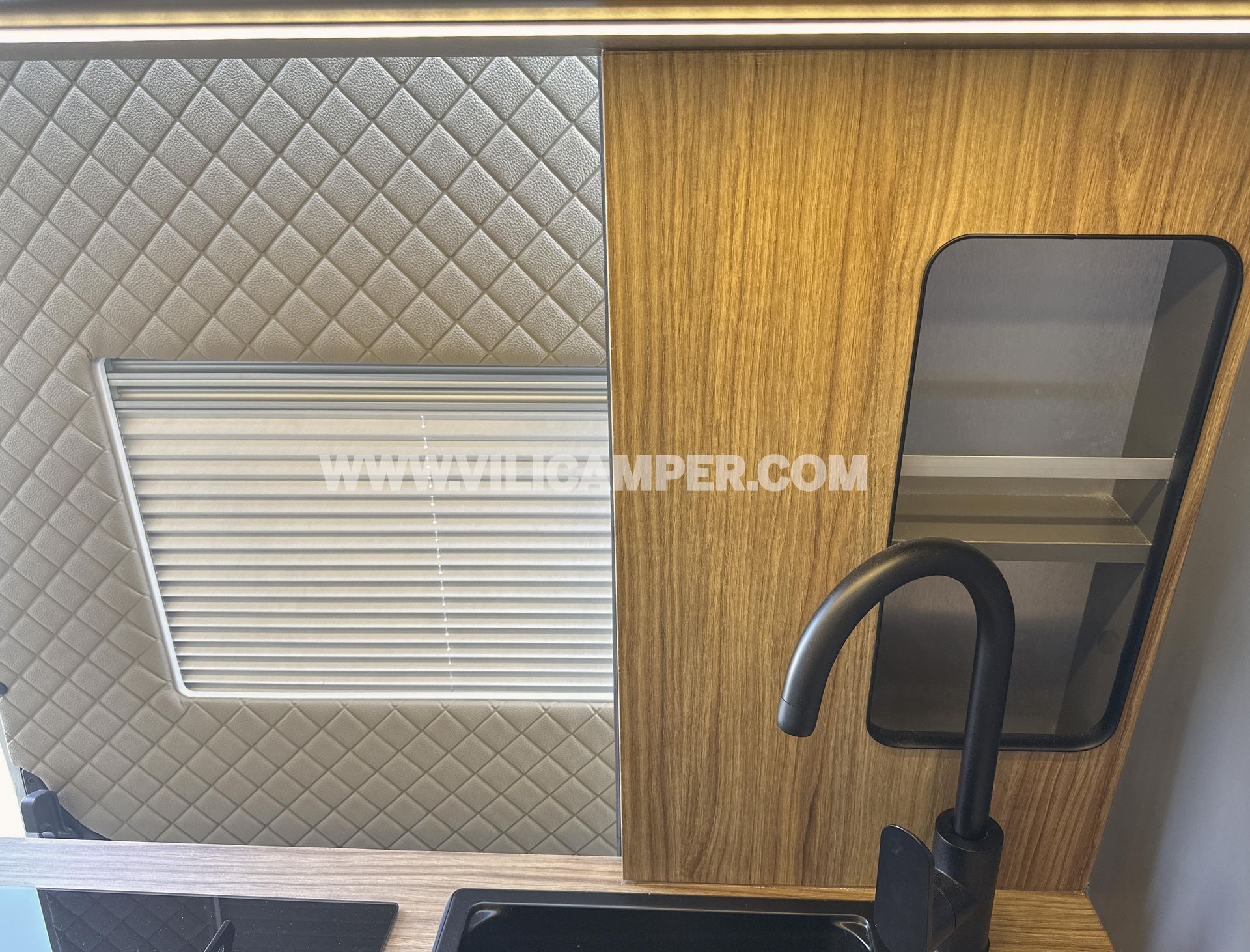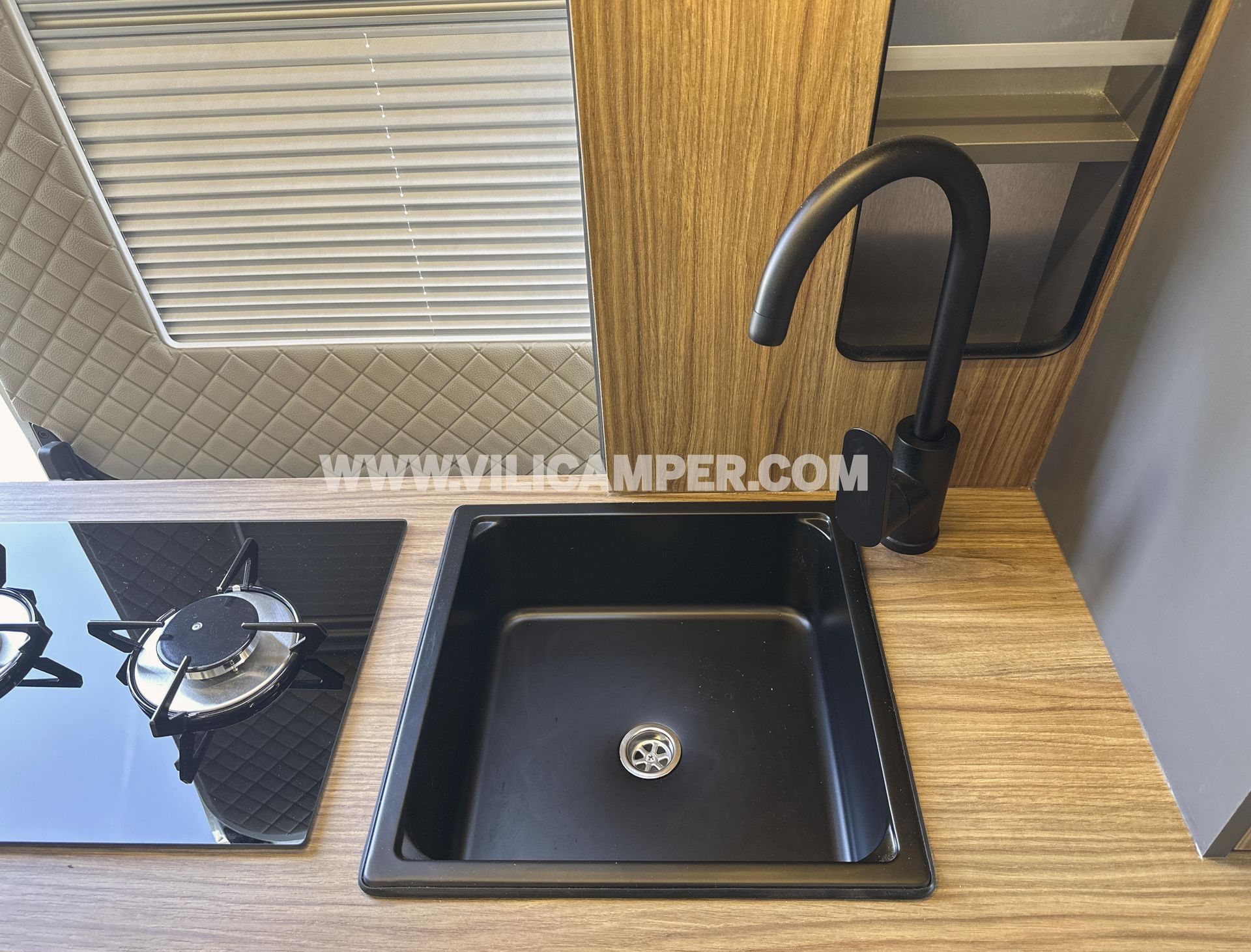 Equipamiento de Cocina: Hemos instalado un fregadero independiente de 35x35 cm con un grifo de caño alto, facilitando el lavado de cazuelas y platos. Además, hemos añadido un microondas, proporcionando más opciones para preparar tus comidas. Hemos optado por no instalar una cocina fija, sino una portátil, lo que te permite cocinar tanto dentro como fuera de la furgoneta, adaptándote a cualquier situación y disfrutando de la máxima flexibilidad.