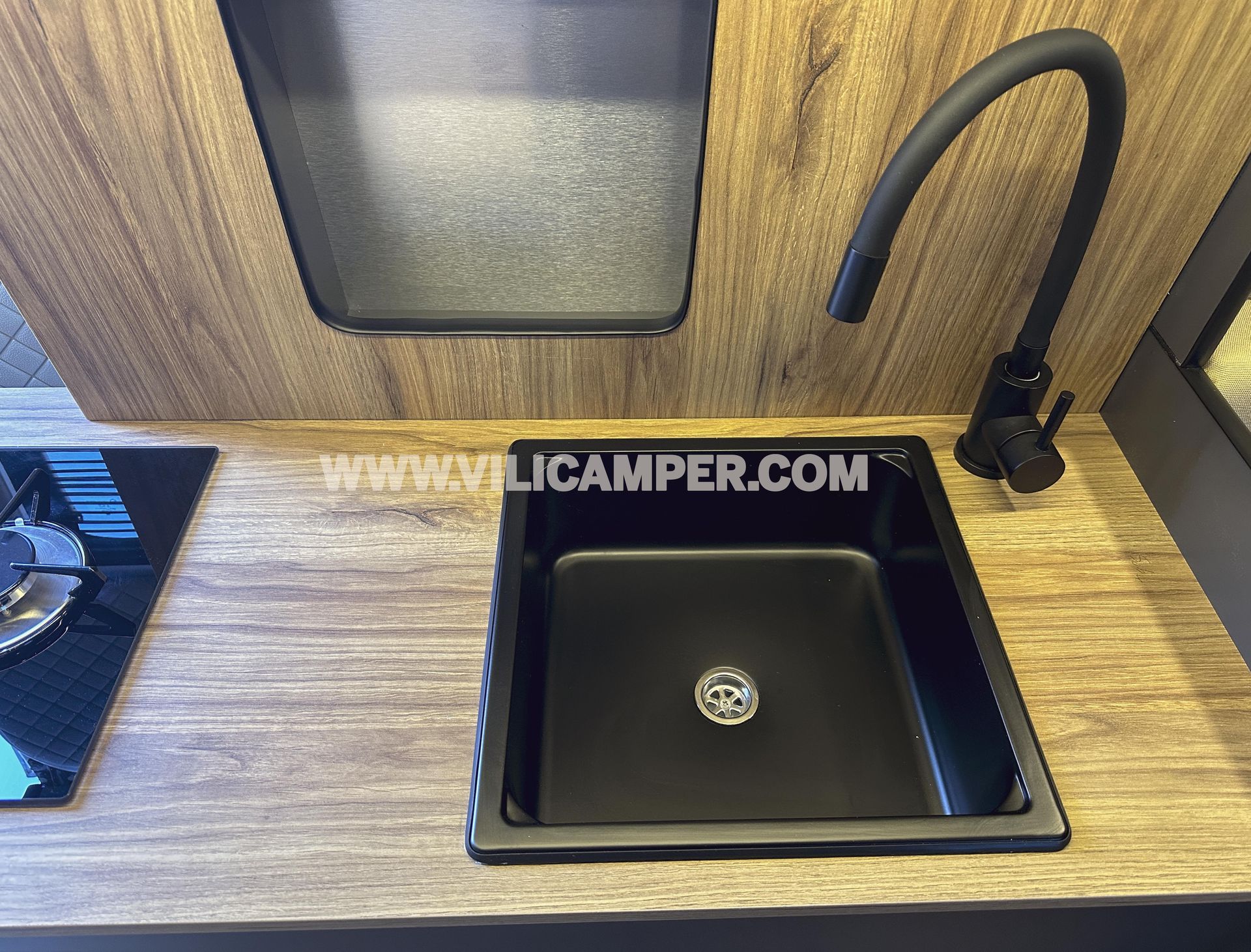 Cocina 2 fuegos Thertford y fregadero independiente con grifo de caño alto