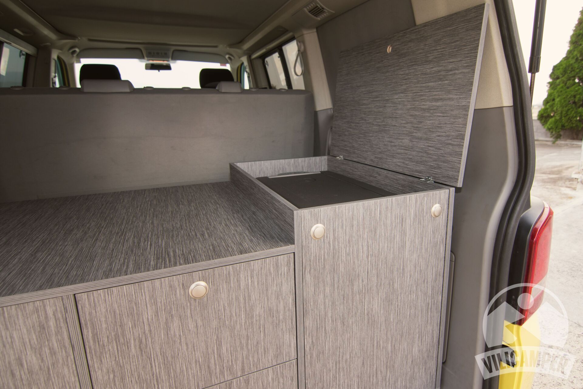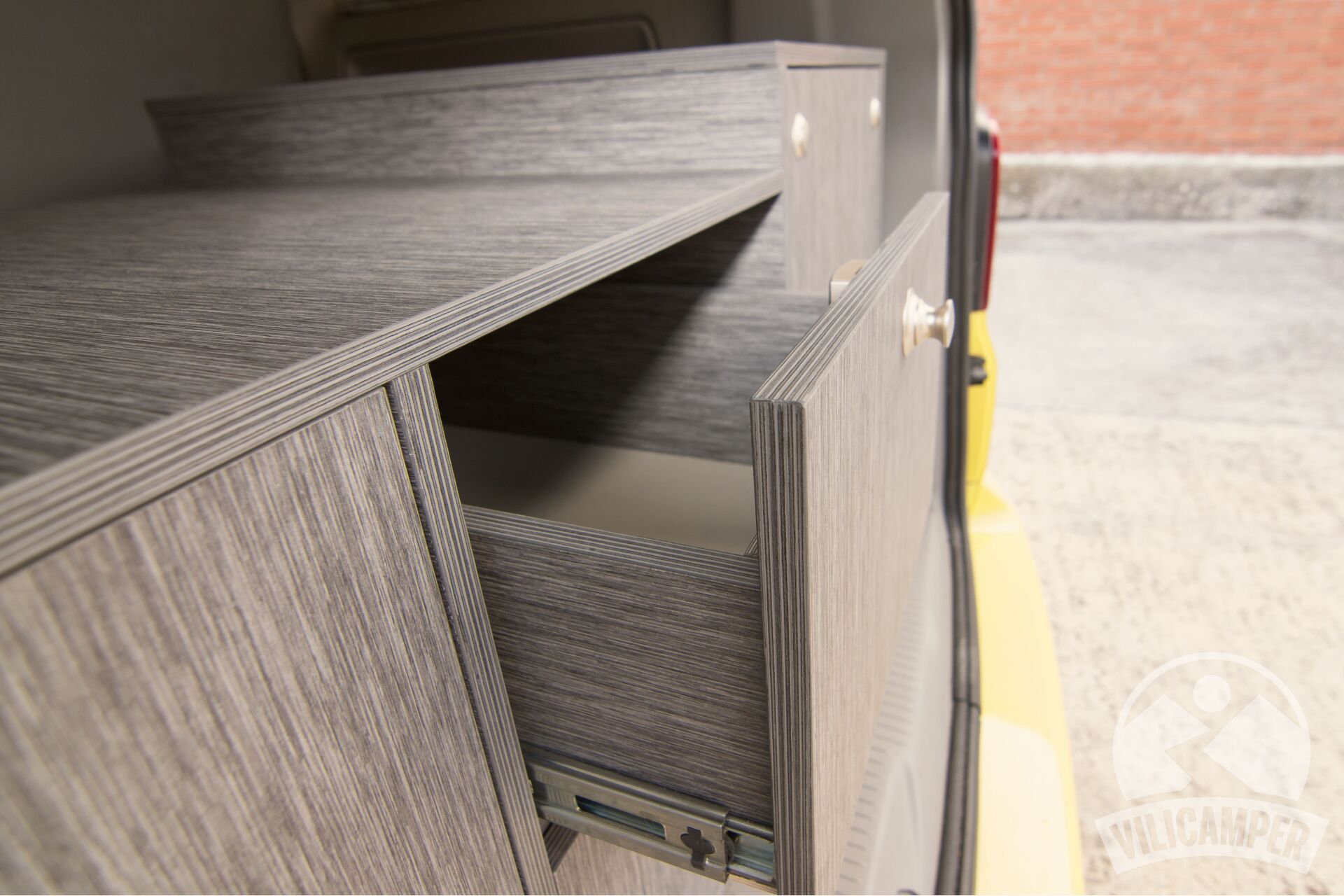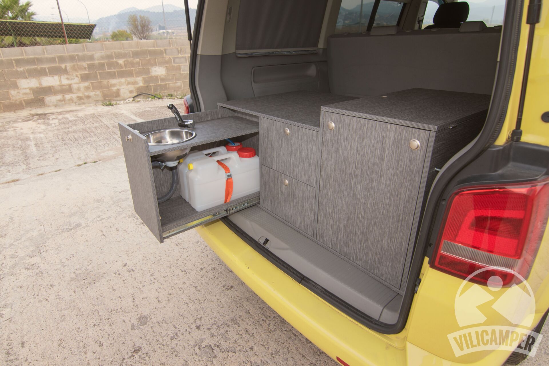En esta ocasión hemos fabricado un kit camper para una Volkswagen California Beach totalmente a las medidas requeridas por el cliente para aprovechar la nevera que ya tenian, a la vez hemos añadido un práctico fregadero con mini depósitos de agua y cajones de almacenamiento.