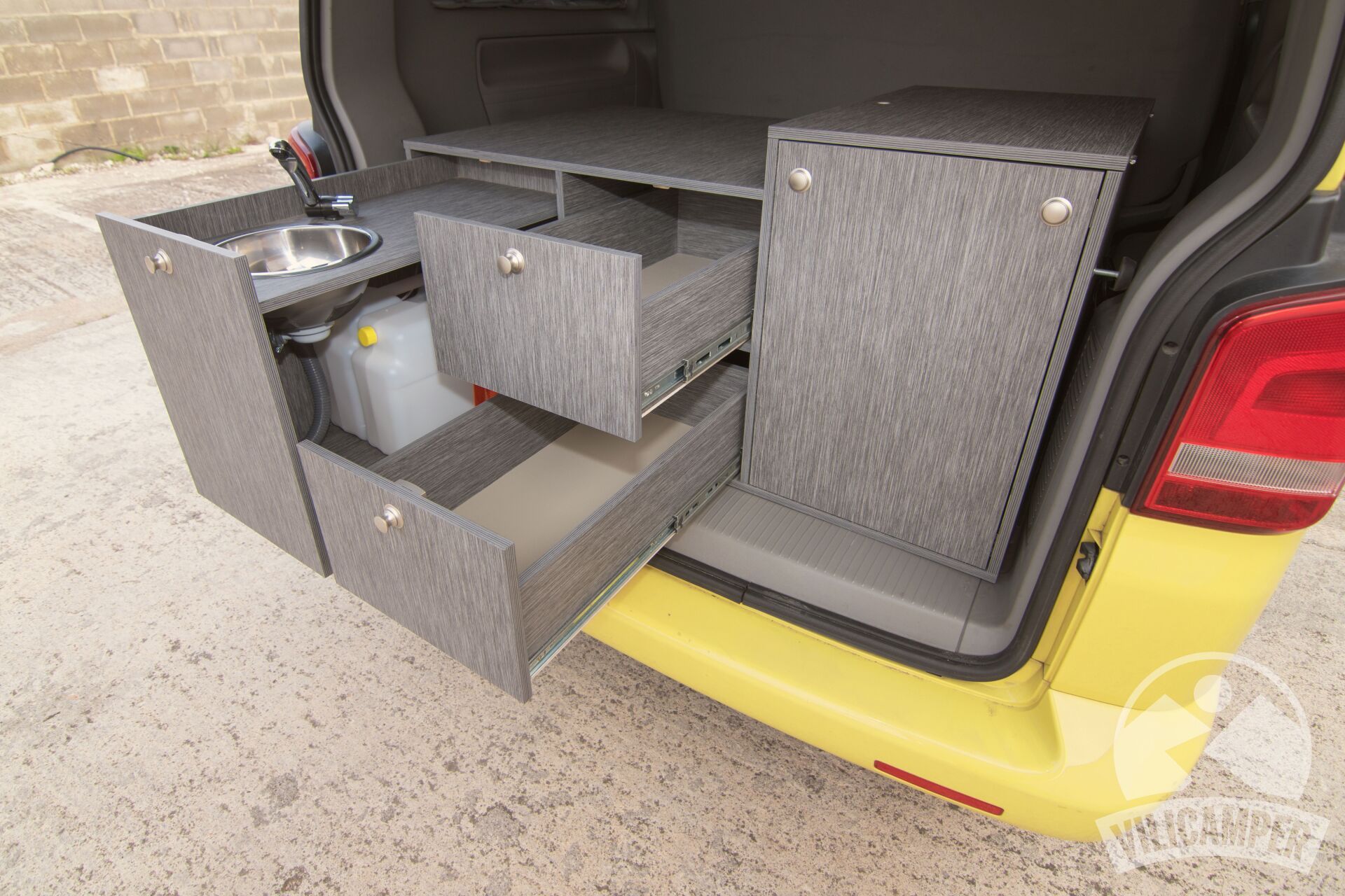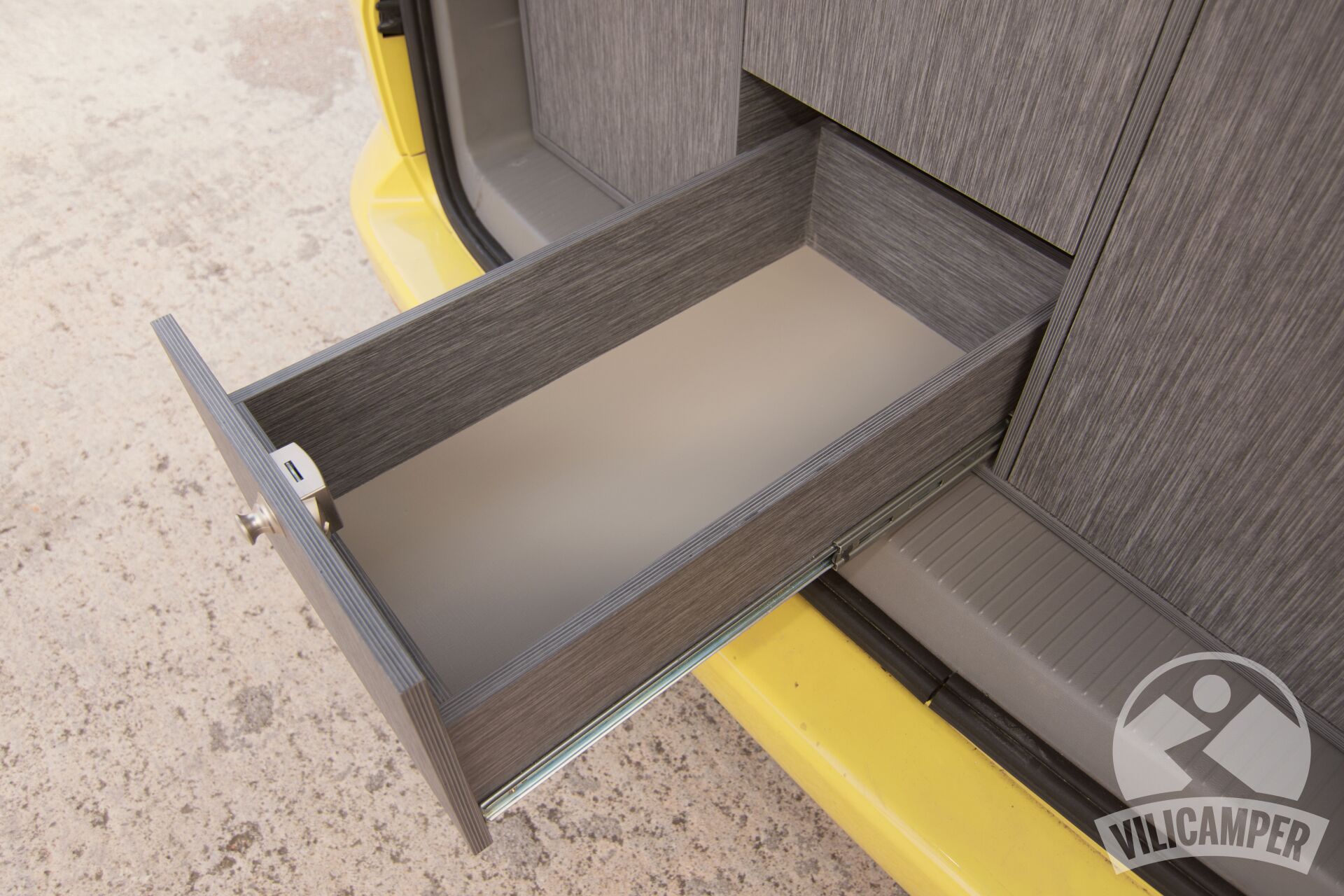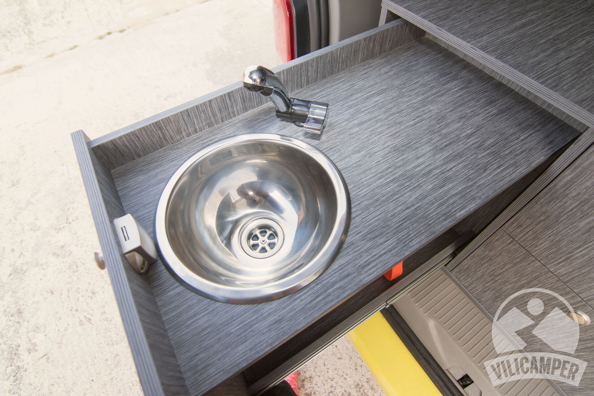 En esta ocasión hemos fabricado un kit camper para una Volkswagen California Beach totalmente a las medidas requeridas por el cliente para aprovechar la nevera que ya tenian, a la vez hemos añadido un práctico fregadero con mini depósitos de agua y cajones de almacenamiento.